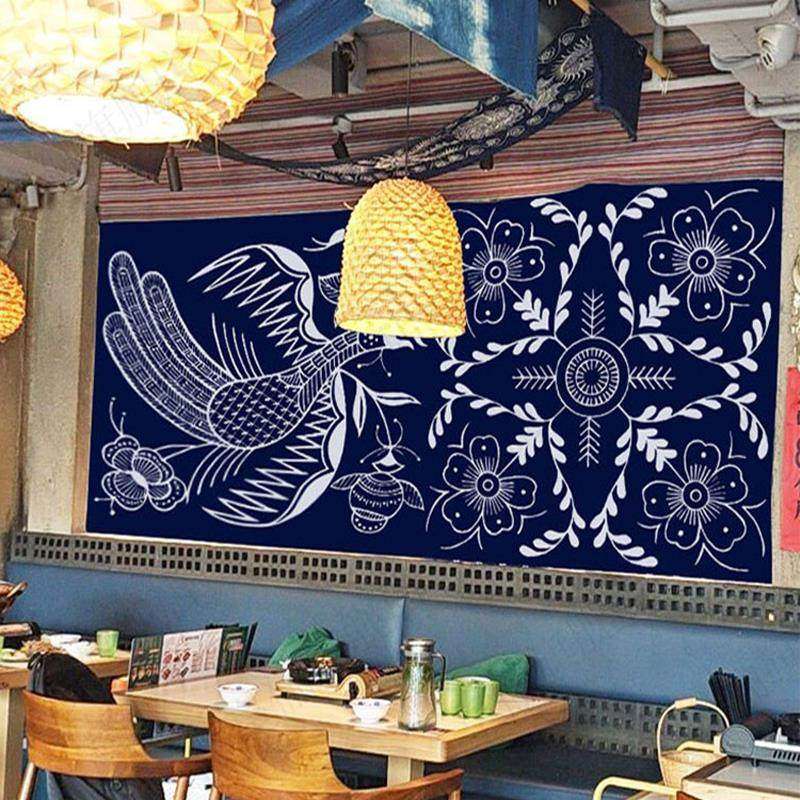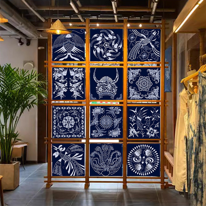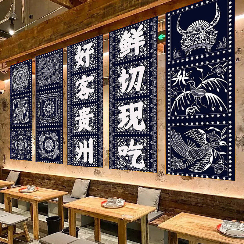 贵州酸汤火锅店方形吊顶天幕挂布定制苗族蜡染民族风装饰背景布幔