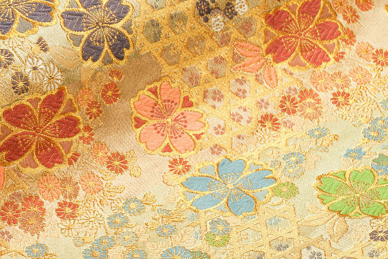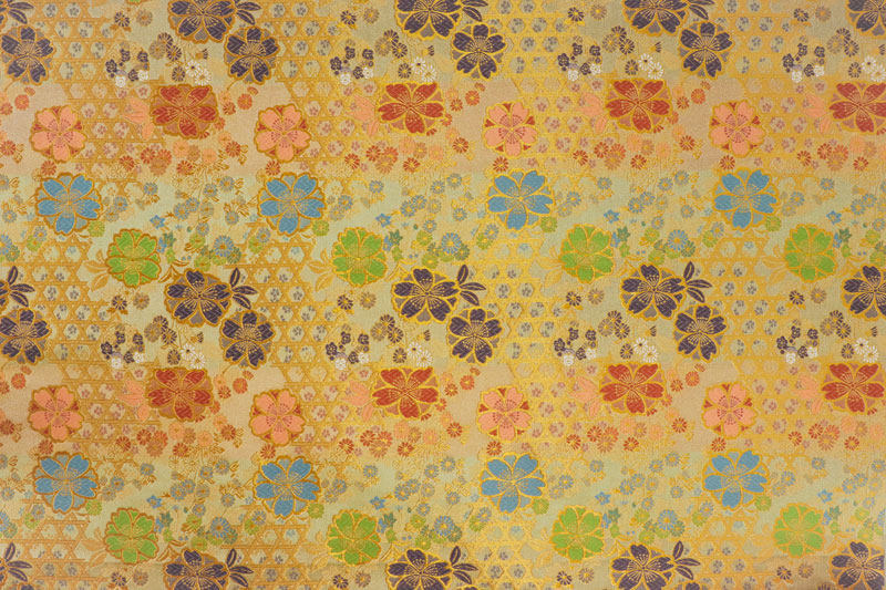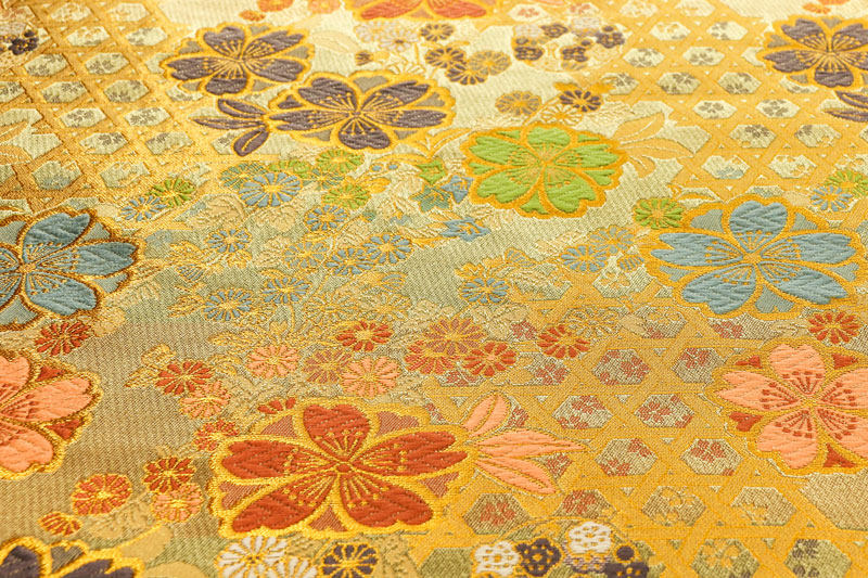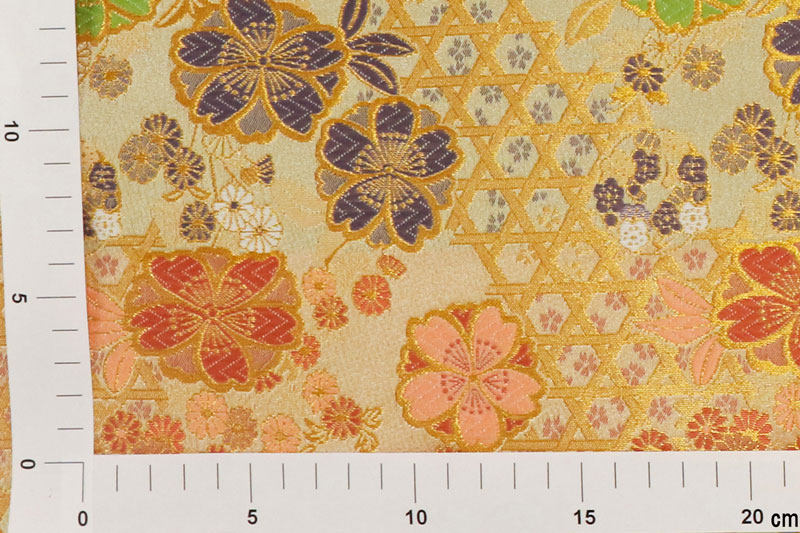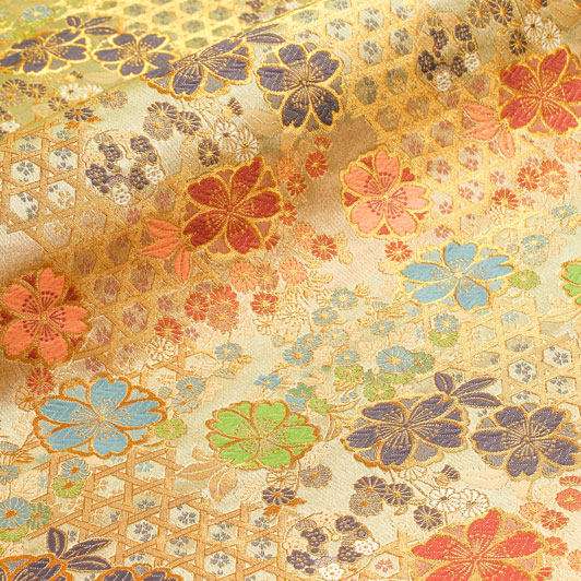 日本进口 和风布料 西阵织 金襕织锦缎 籠目垣に八重桜(黄)