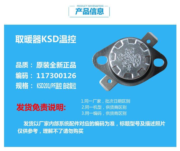 正品格力电热油汀取暖器温控器开关117300126 KSD201/PF 16A 60℃