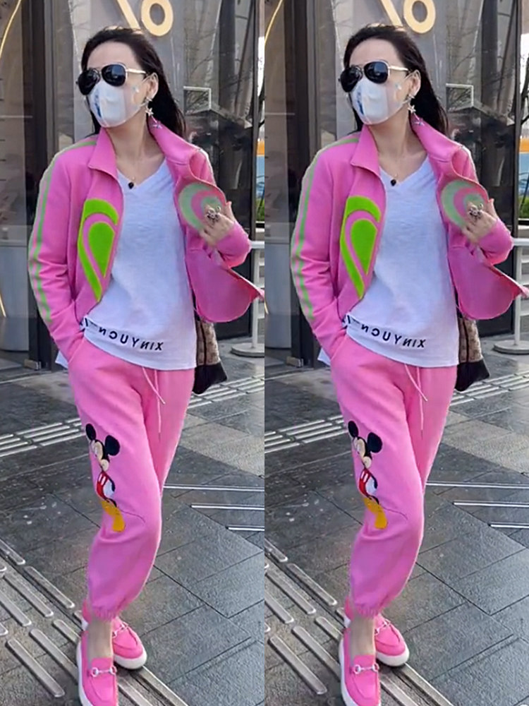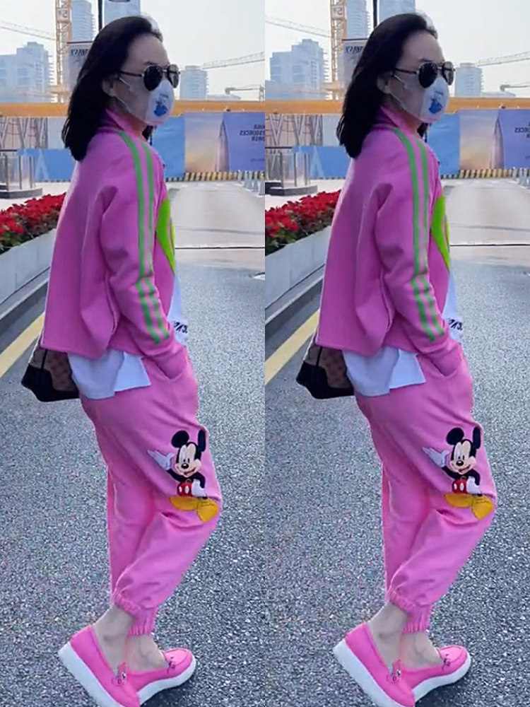 时尚套装女2025早春装新款宽松外套棒球服米奇图案粉色休闲卫裤潮