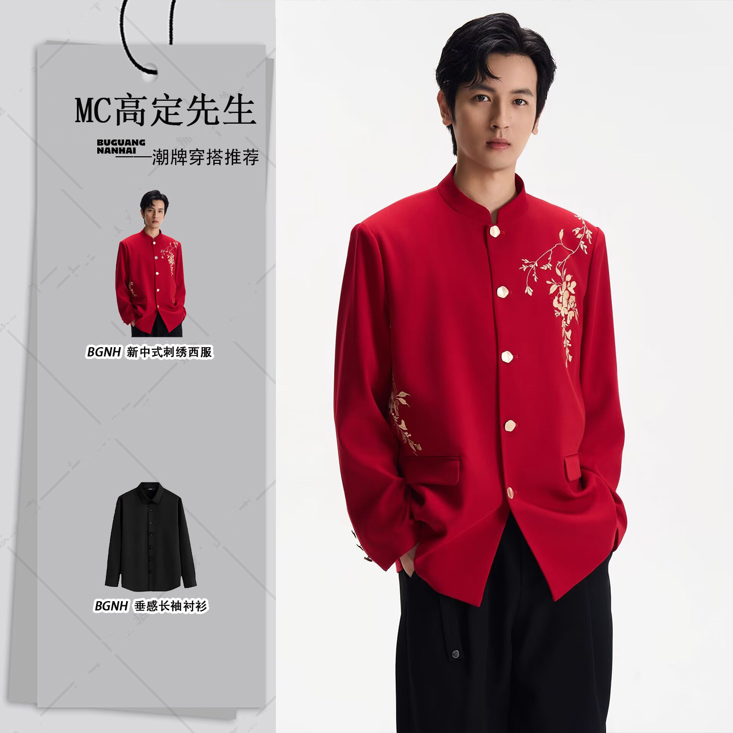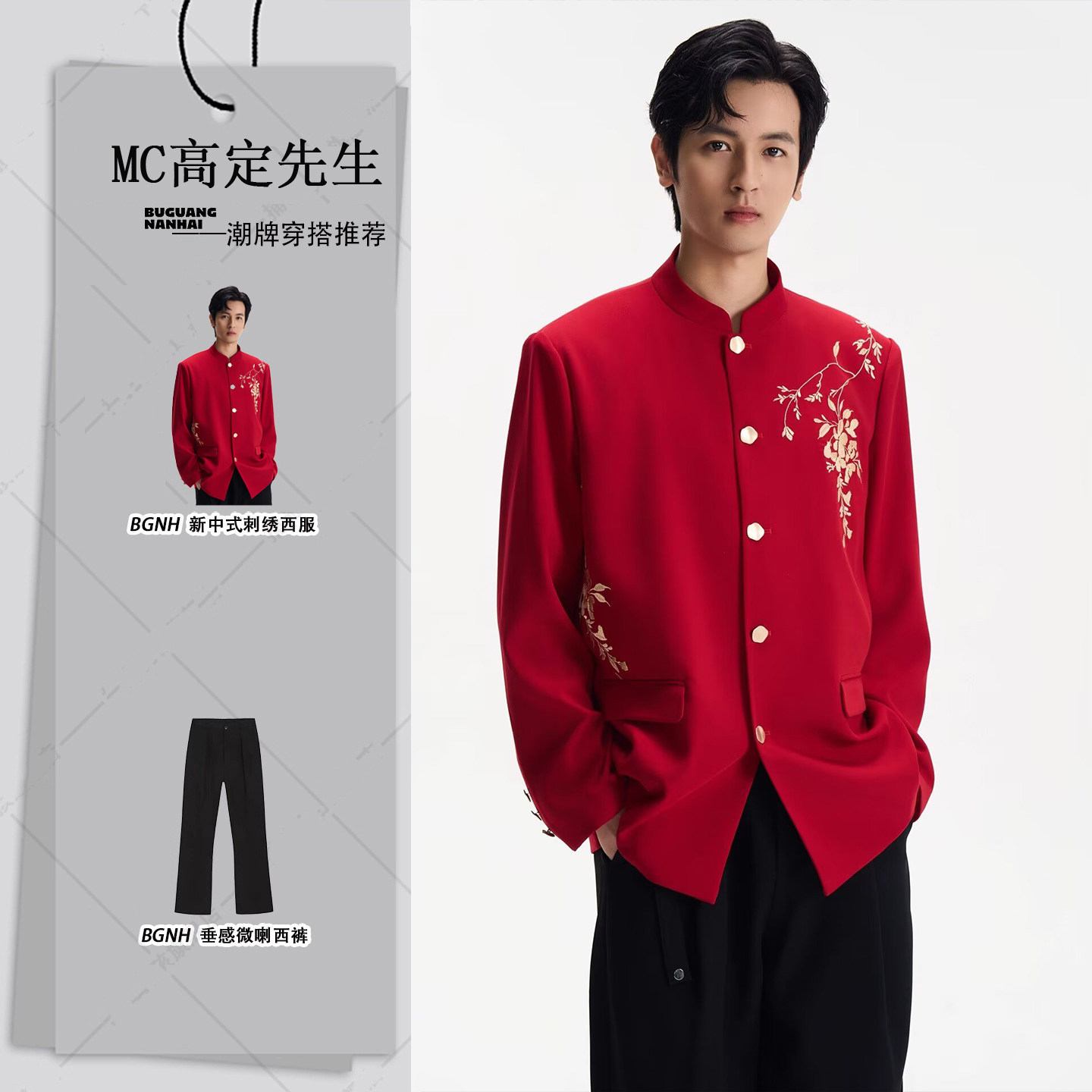 新中式国风西装高端绣花立领休闲西服中山装外套红色订婚结婚礼服