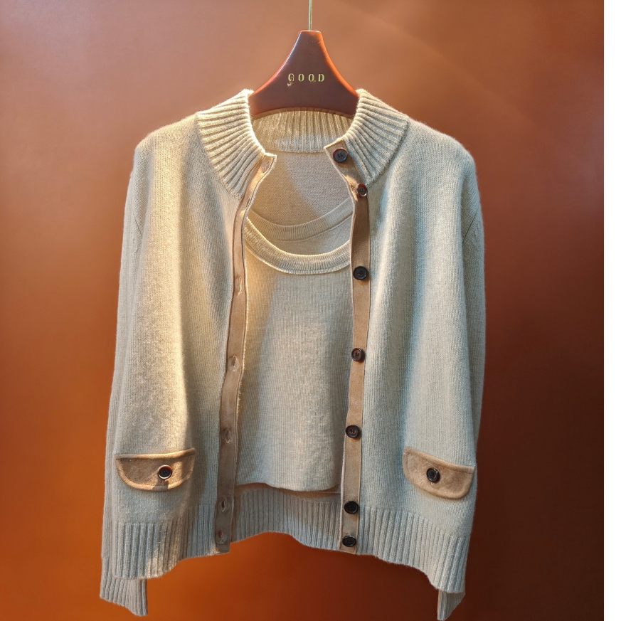 洋气老钱风羊绒外套 撞色拼接麂皮绒 立领保暖飞行夹克女士开衫