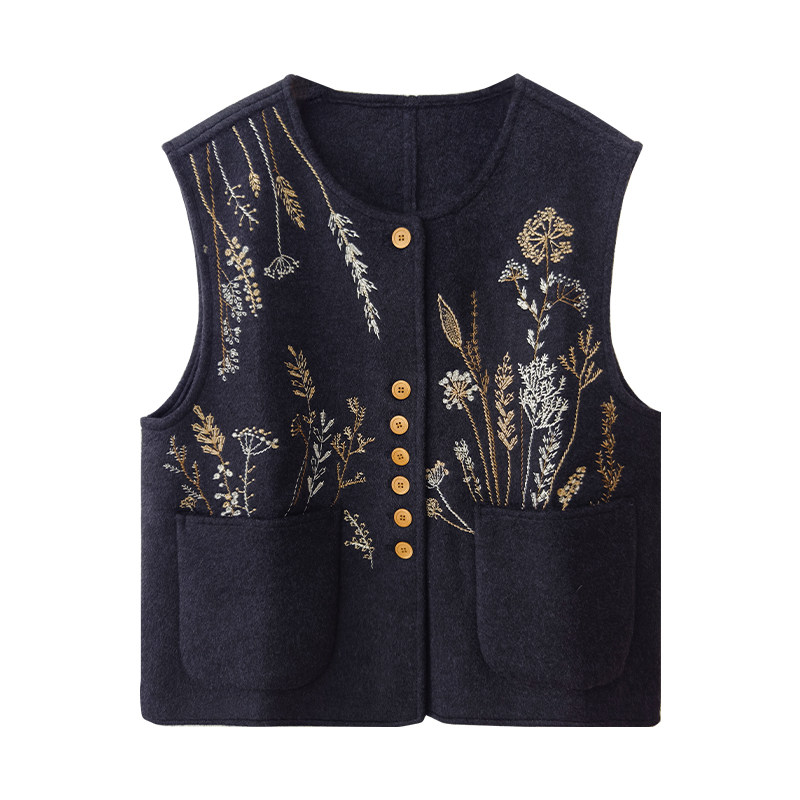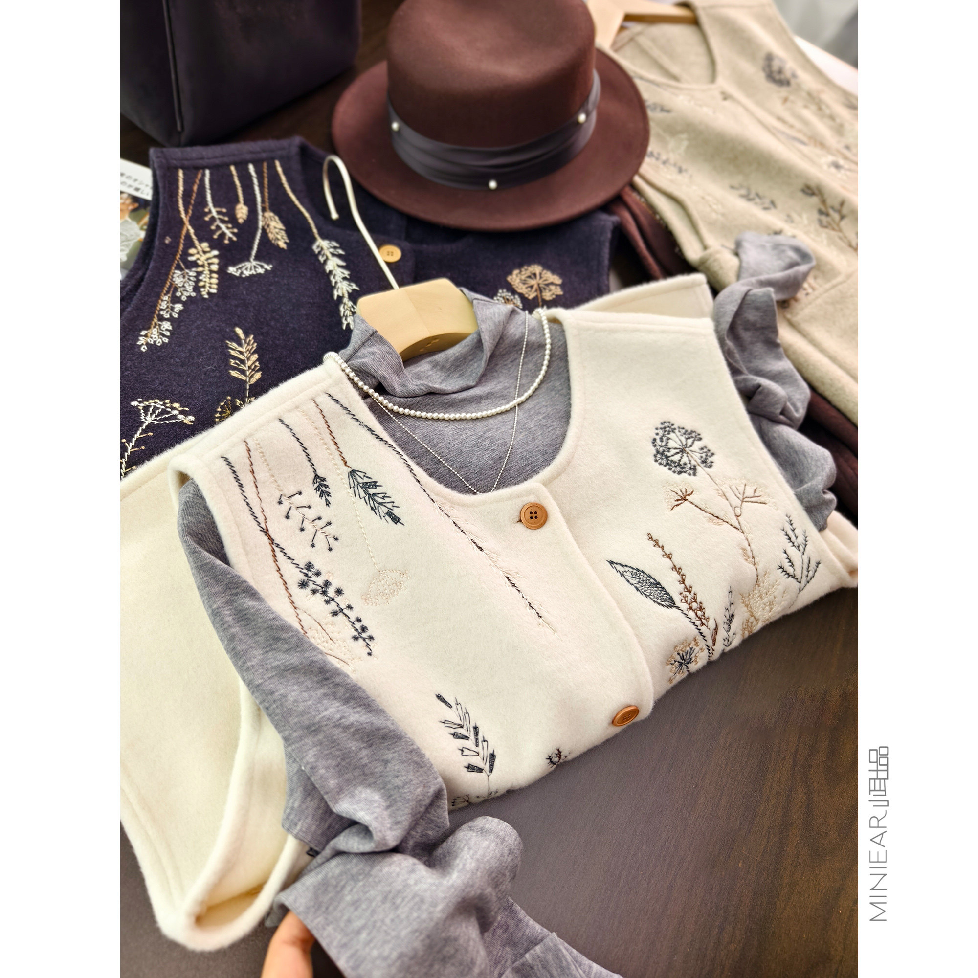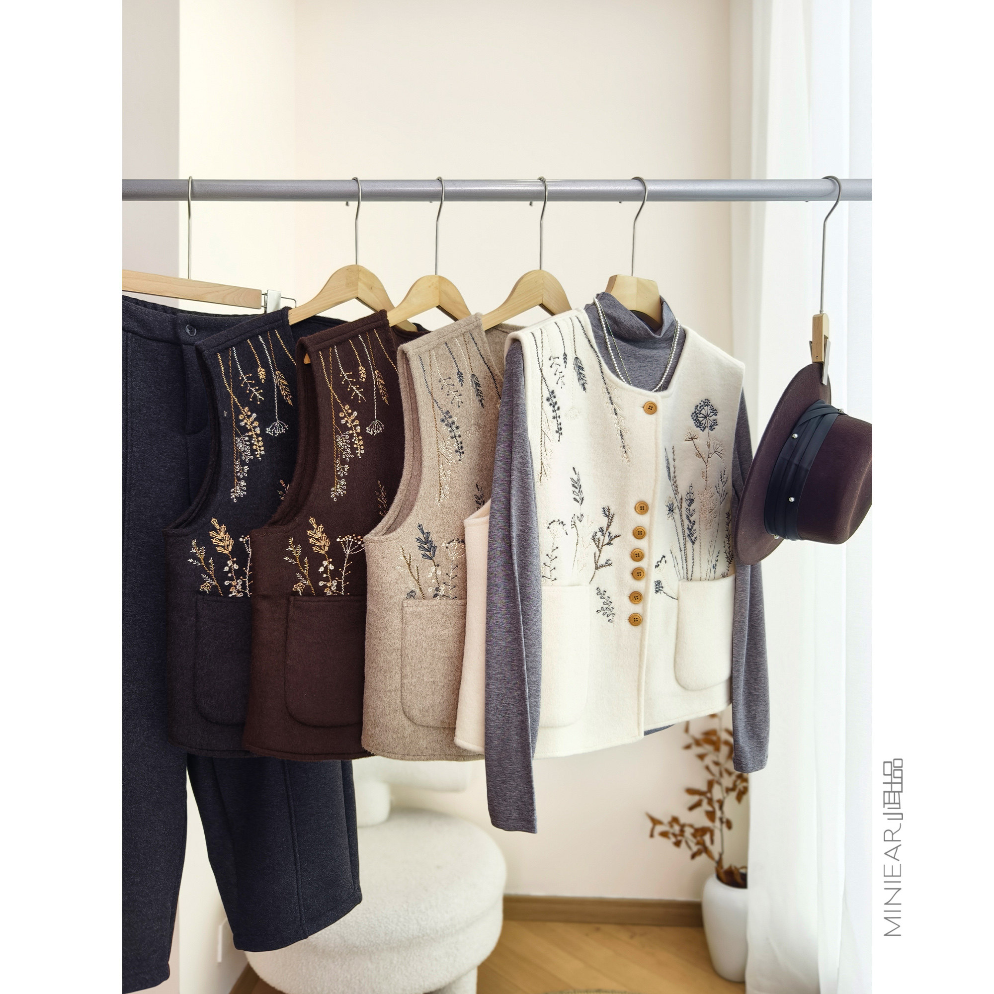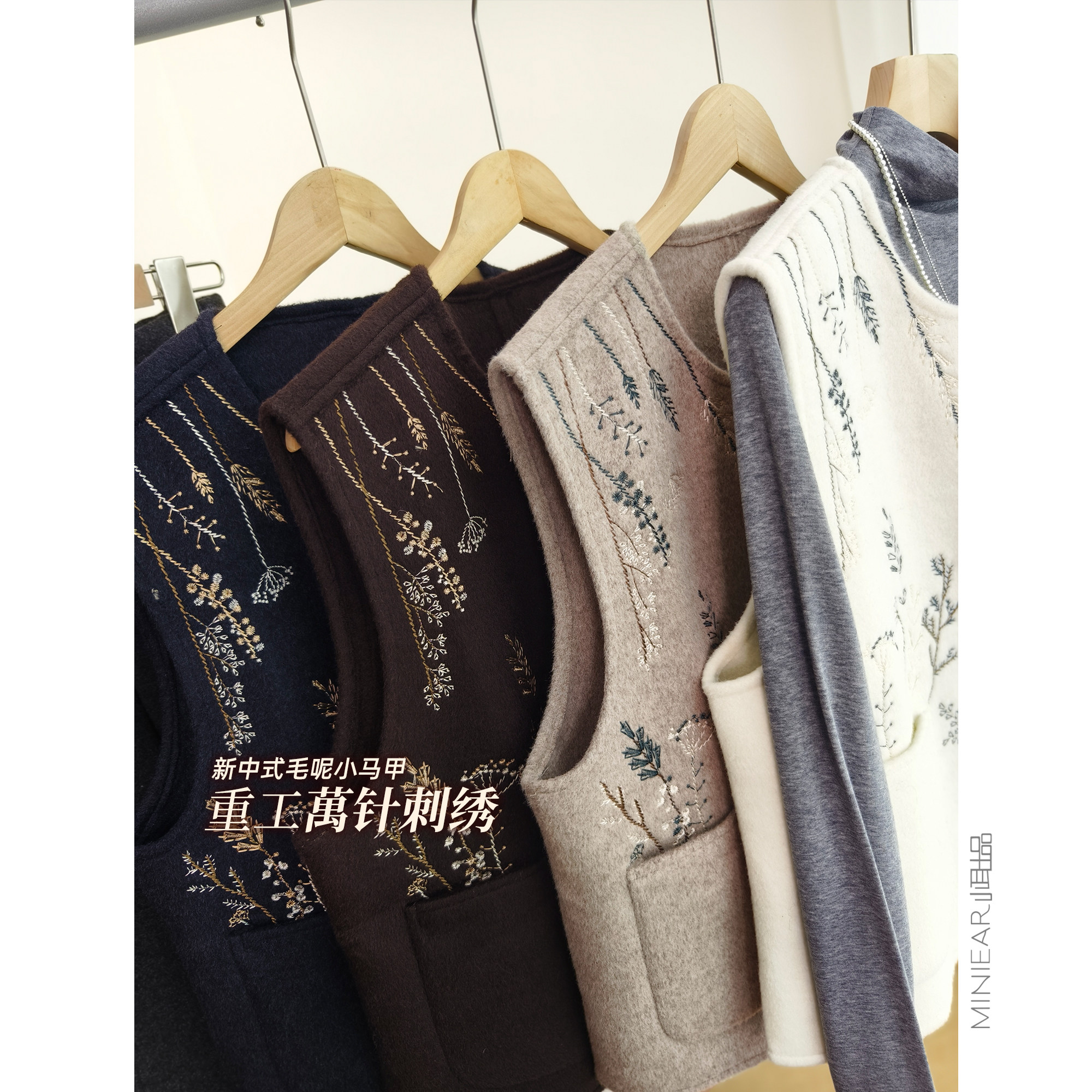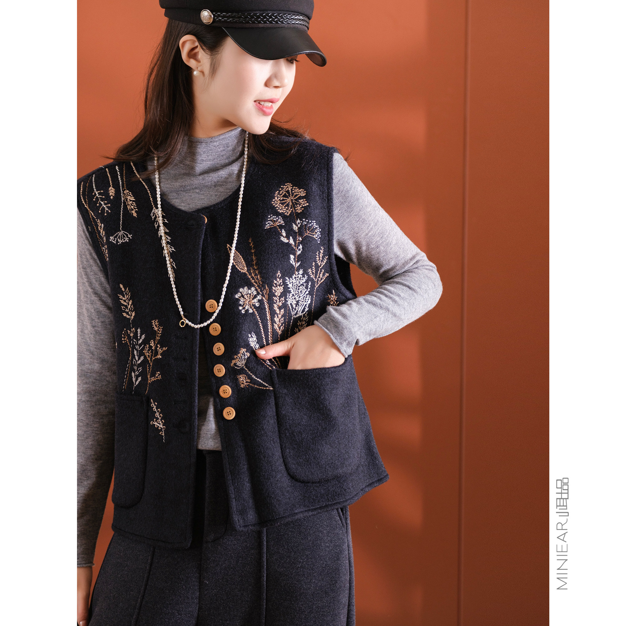 小耳出品 调性重工款~精緻萬针刺绣/加厚毛呢 单排扣圆领马甲女