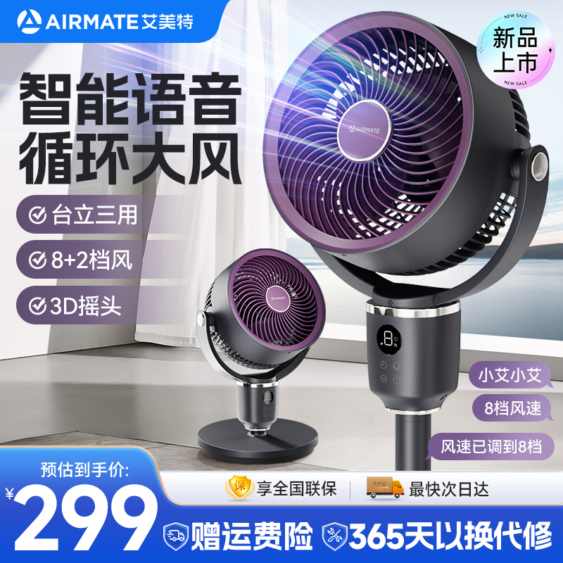 艾美特空气循环扇家用电风扇AI语音3D自动摇头落地扇台式两用新款