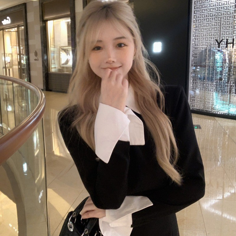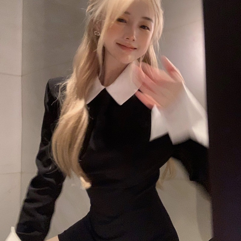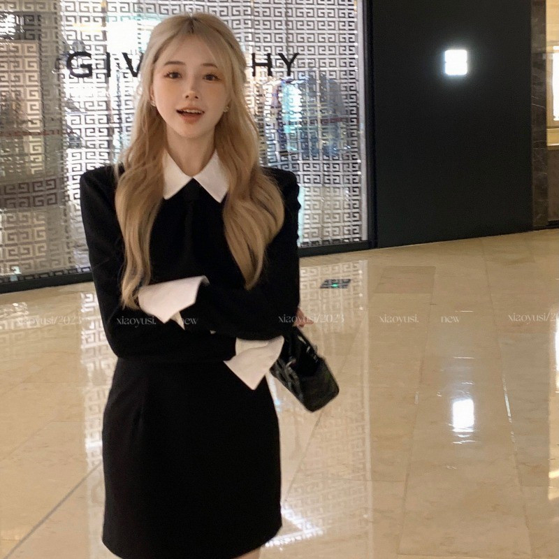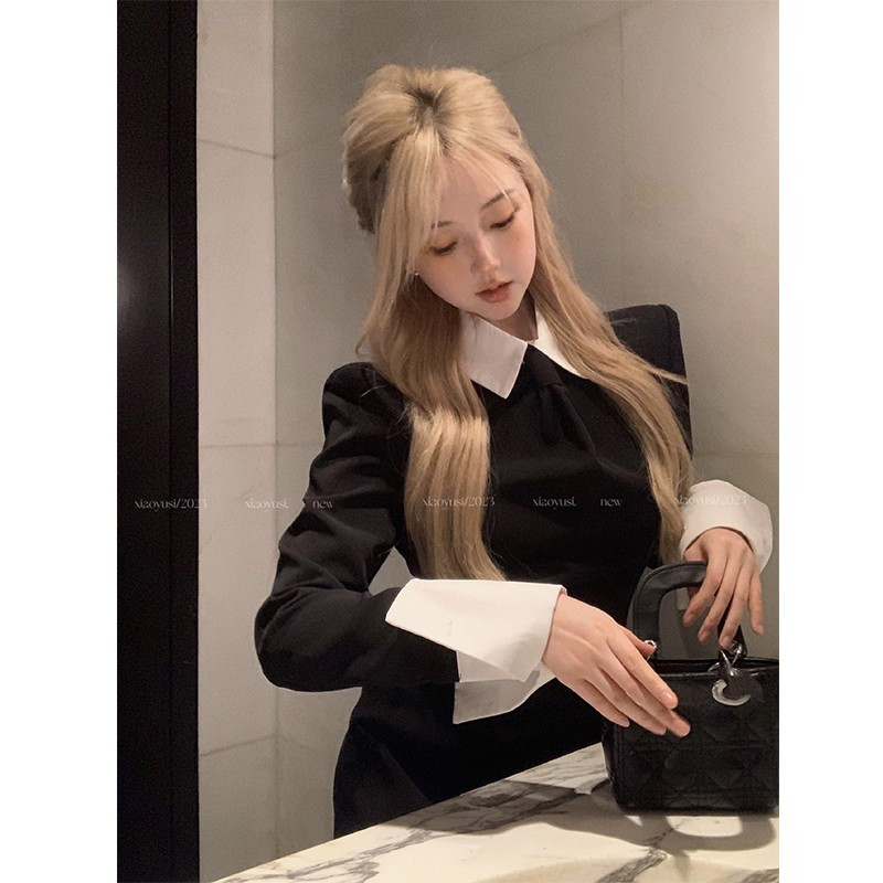 紧身韩版两件法式长袖蝴蝶结连衣裙黑色秋季裙子气质高级臀裙短裙