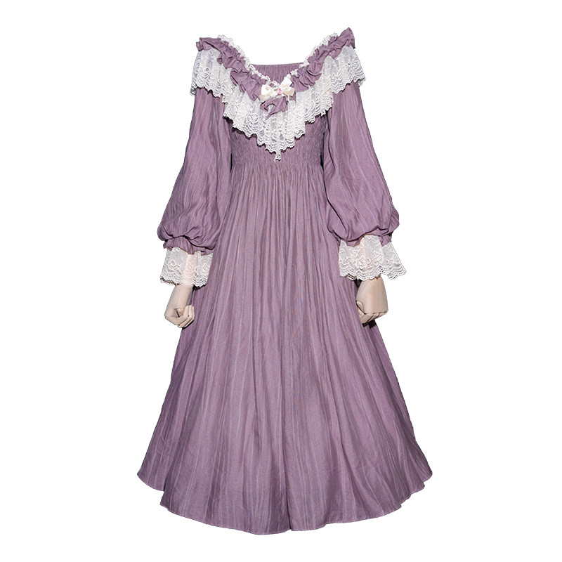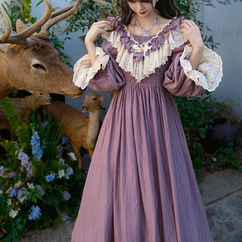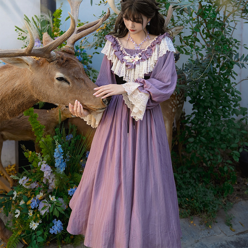 弥爱原创《幻梦紫藤》法式宫廷复古茶会荷叶边灯笼袖晕染连衣裙春