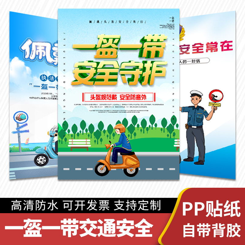 一盔一带交通安全守护安全常在行动骑行戴头盔电动车戴头盔安全出行宣传标语通告图片方案戴头盔安全带海报