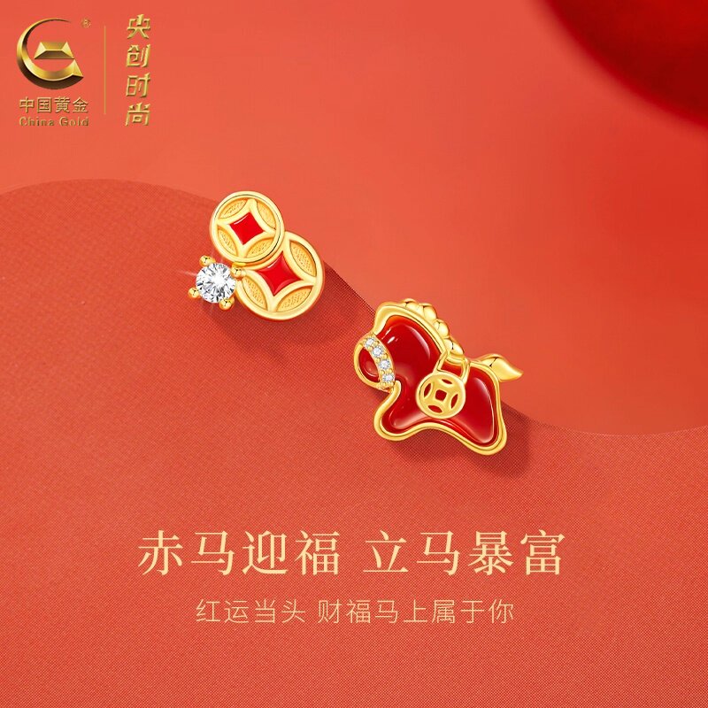 中国黄金央创马年本命年耳钉纯银红玛瑙耳饰女生日礼物属马S925