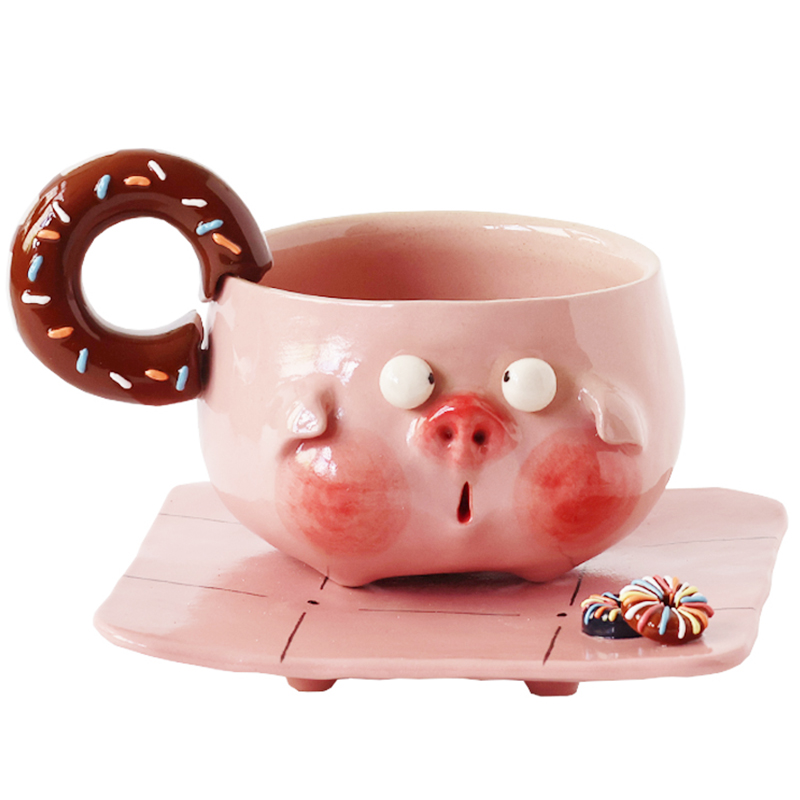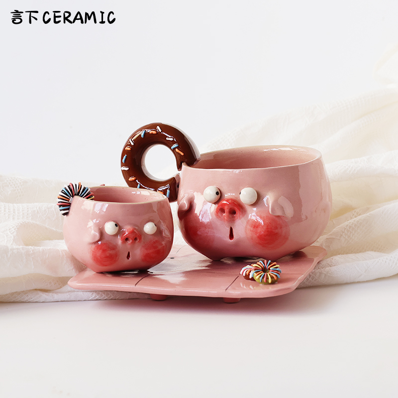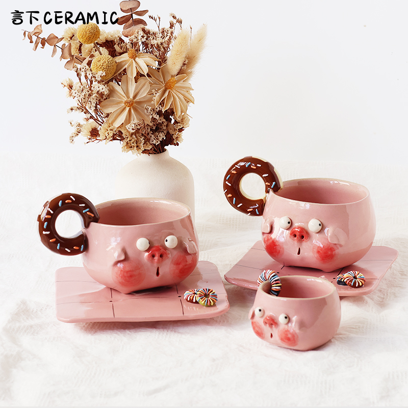 言下餐饮具咖啡杯粉色猪猪可爱甜甜圈带碟稀奇古怪釉下彩高温陶瓷
