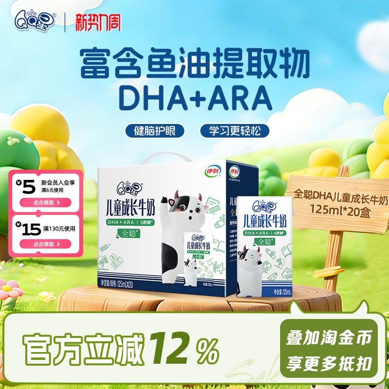 QQ星全聪DHA儿童成长牛奶125ml*20盒0蔗糖维生素纯牛奶学生早餐奶