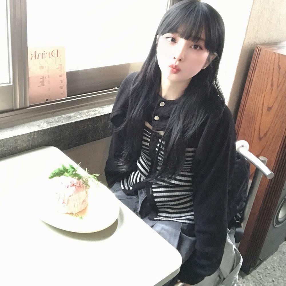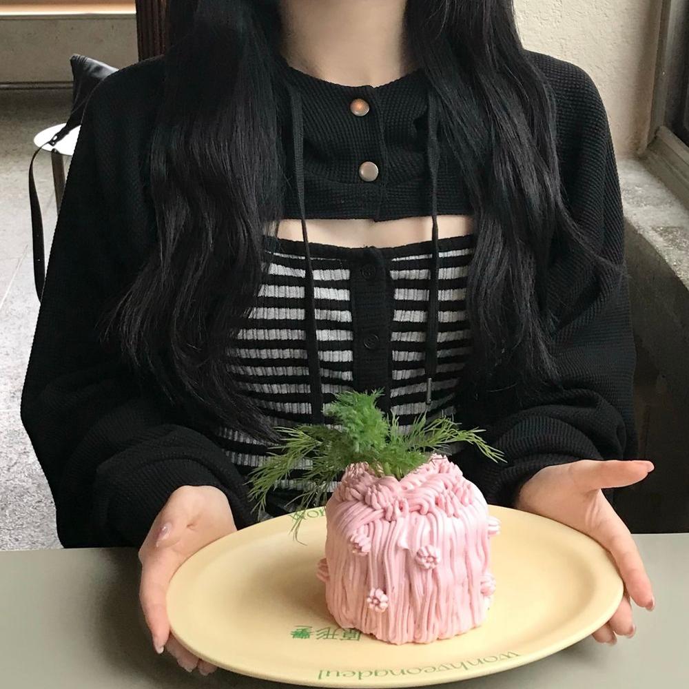 春天记事簿 黑色连帽纽扣短款小外套+条纹小背心 少女叠穿系套装