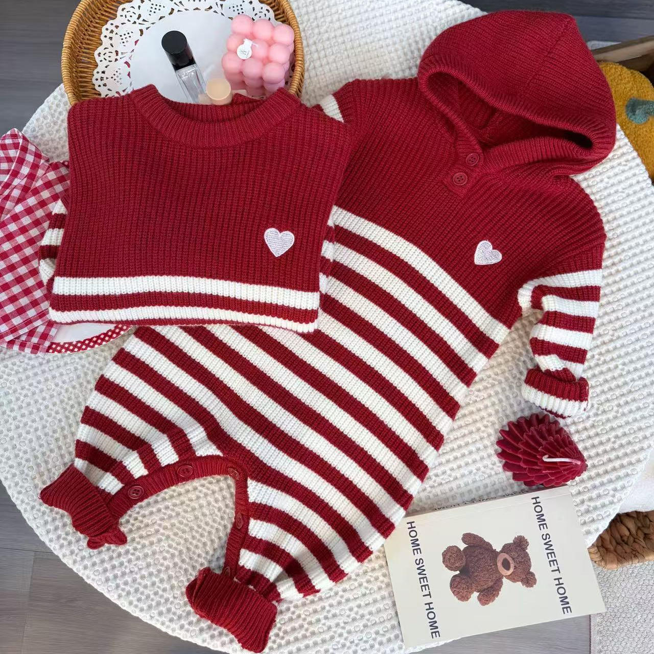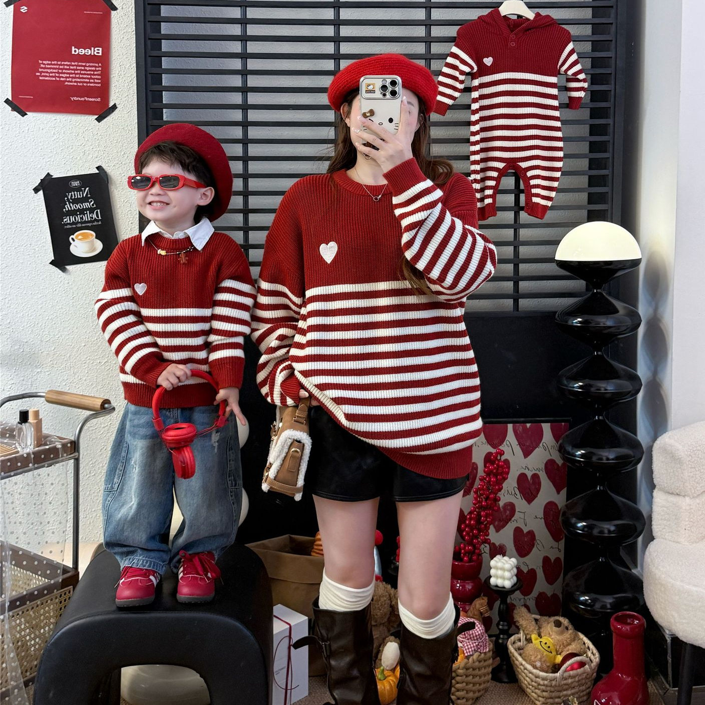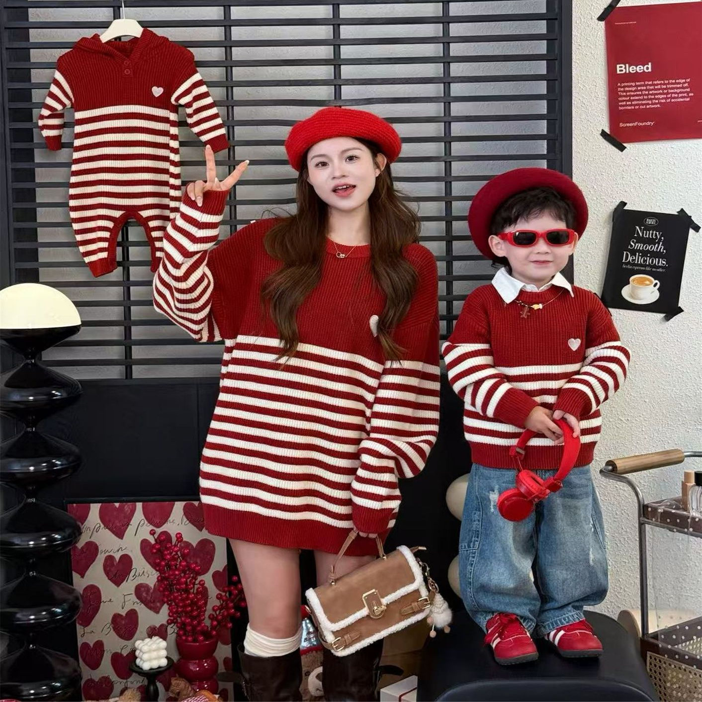 过年亲子装秋冬红色一家三口喜庆爱心条纹毛衣婴儿针织衫连体衣