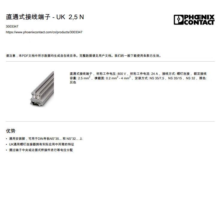 菲尼克斯 Phoenix 接线端子UK2.5N 定货号3003347 原装