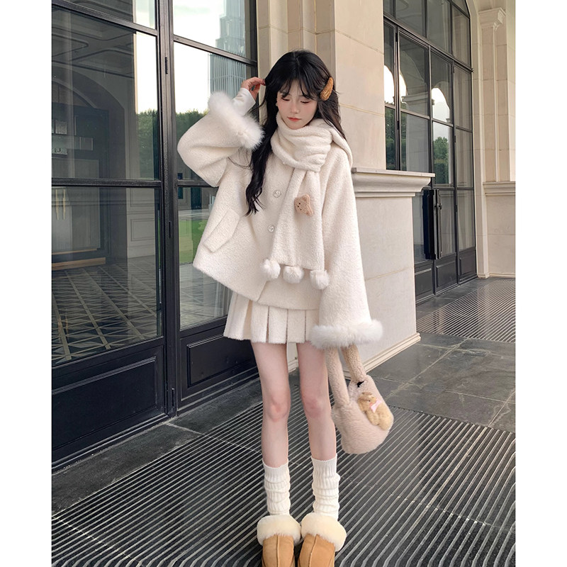 女装/女士精品 2025新款甜美小个子显瘦白色毛绒外套半身裙两件套