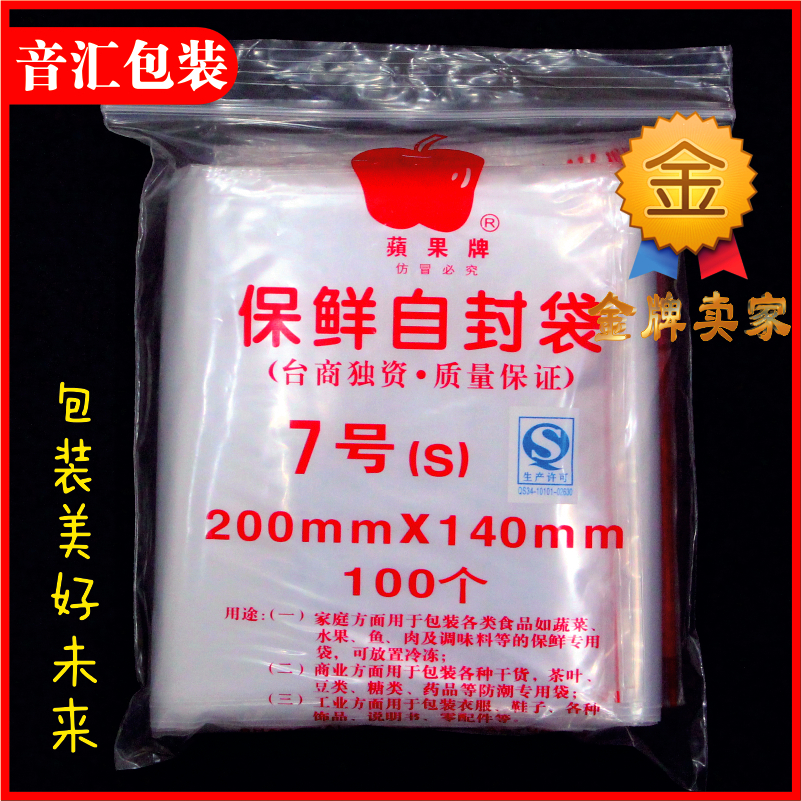 苹果牌自封袋7号夹链密封保鲜袋包装食品袋透明袋加厚封口袋100只