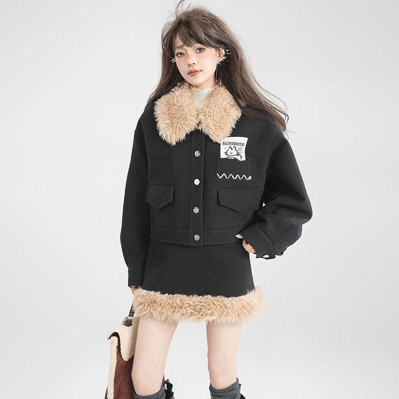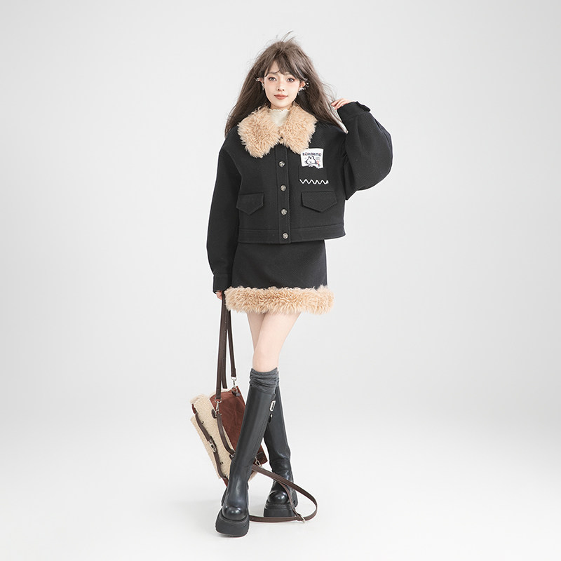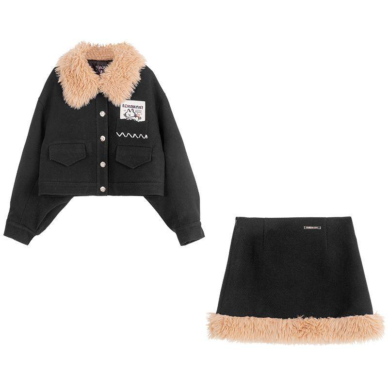 KEIKO 撞色毛绒翻领毛呢两件套装25秋冬时髦短款夹克外套+半身裙