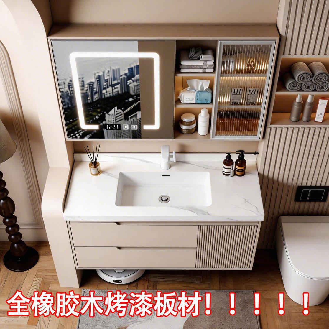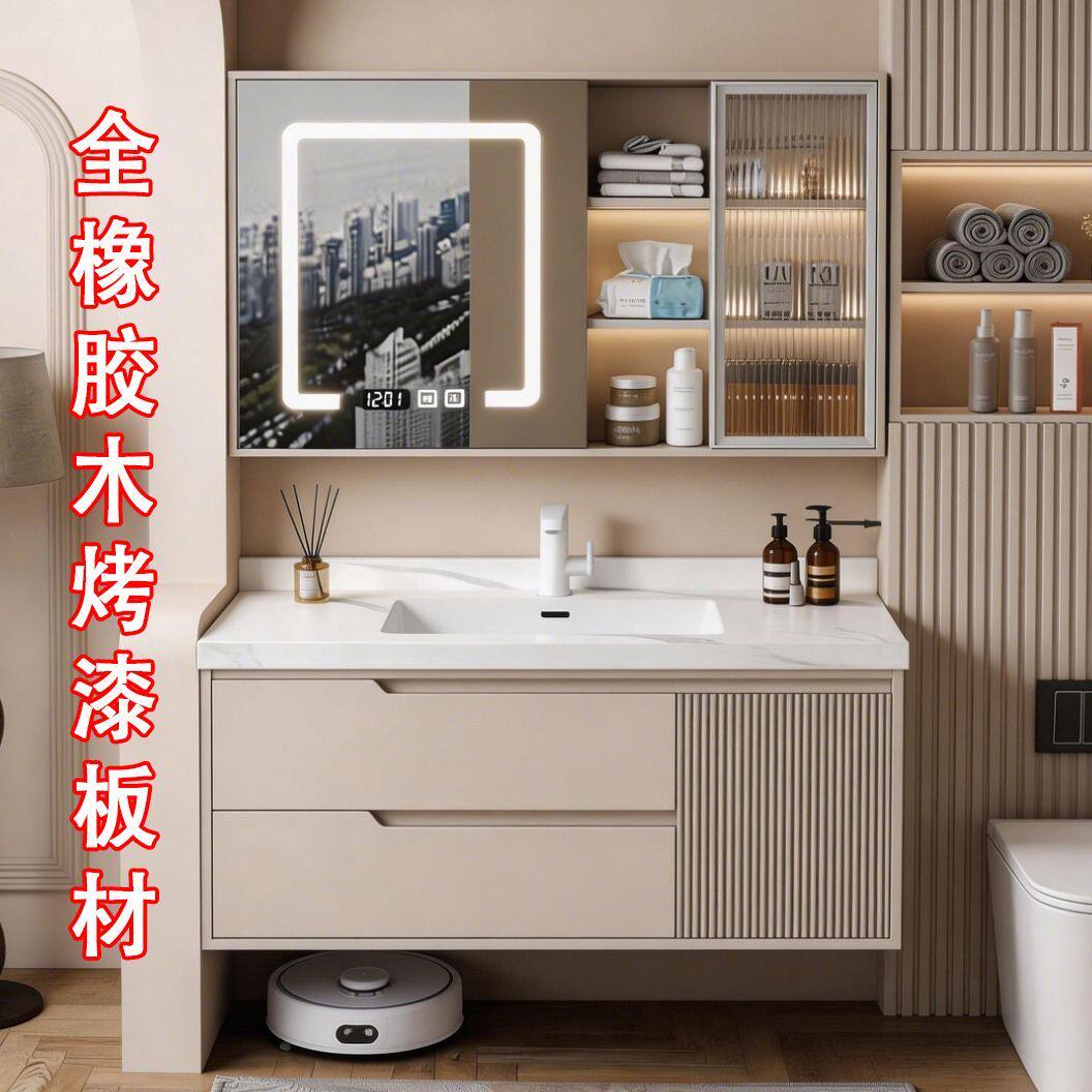 莫顿橡胶木烤漆奶油风浴室柜组合岩板陶瓷无缝盆卫生间洗手洗脸盆