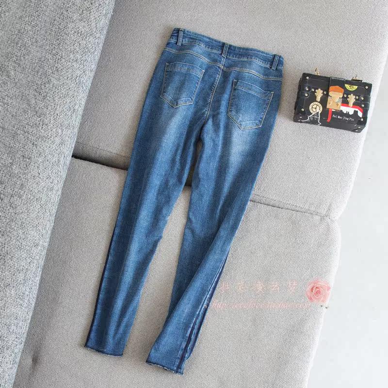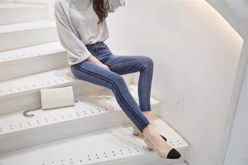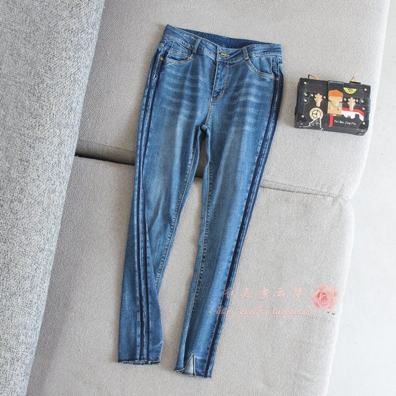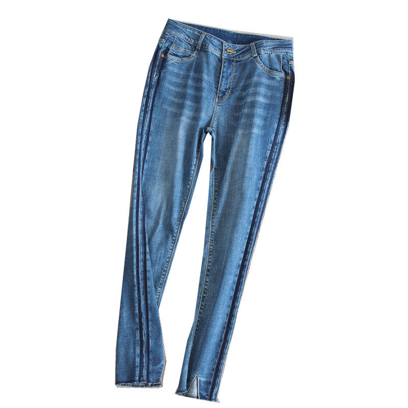 薄棉弹款女式牛仔裤九分裤脚开叉棉弹铅笔裤扎染侧边加深竖条春秋