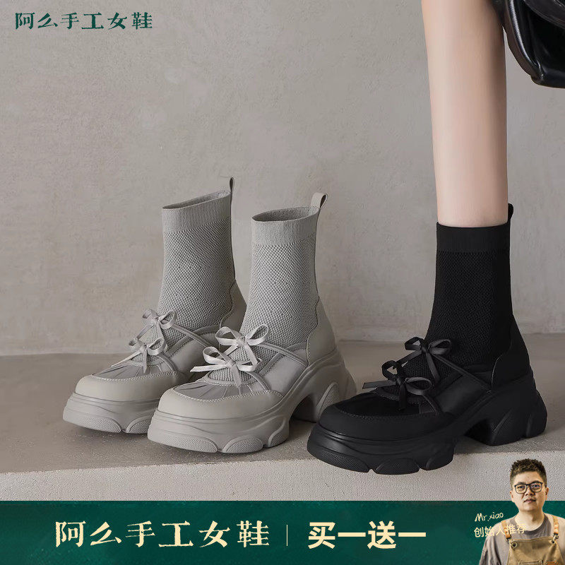 阿么手工女鞋厚底机械针织弹力靴透气舒适粗跟机能风袜靴2026新款
