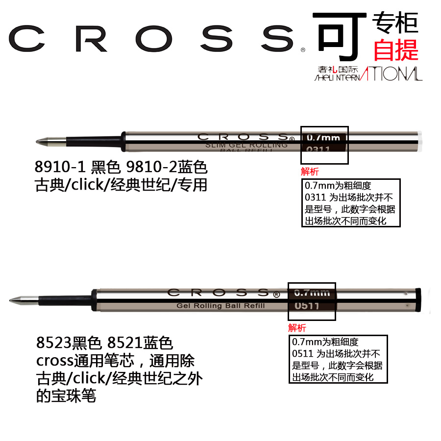 美国CROSS水性笔签字笔笔芯8523髙仕宝珠笔笔芯蓝色8521古典8910