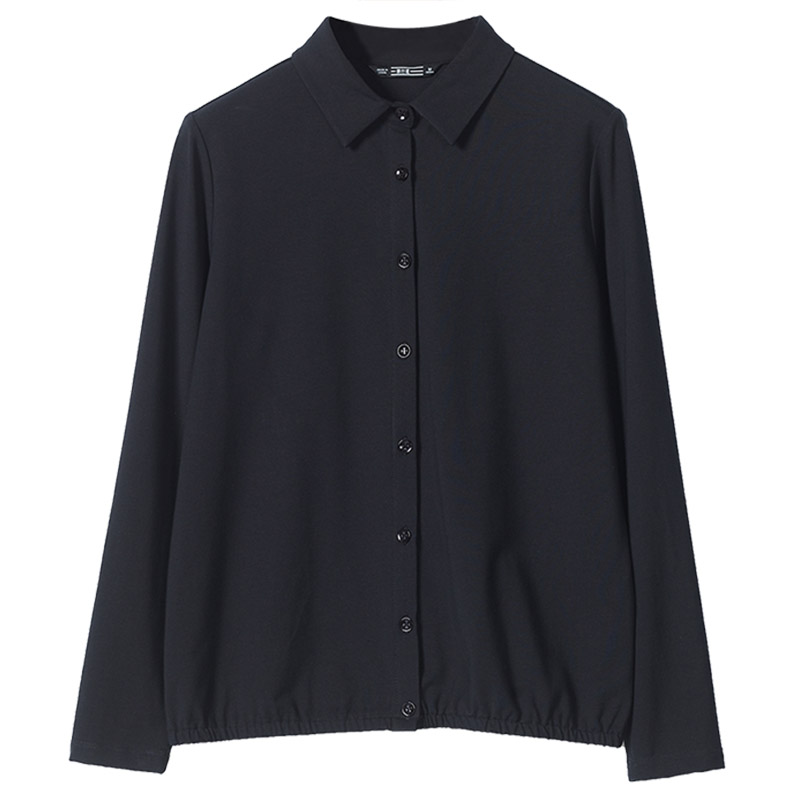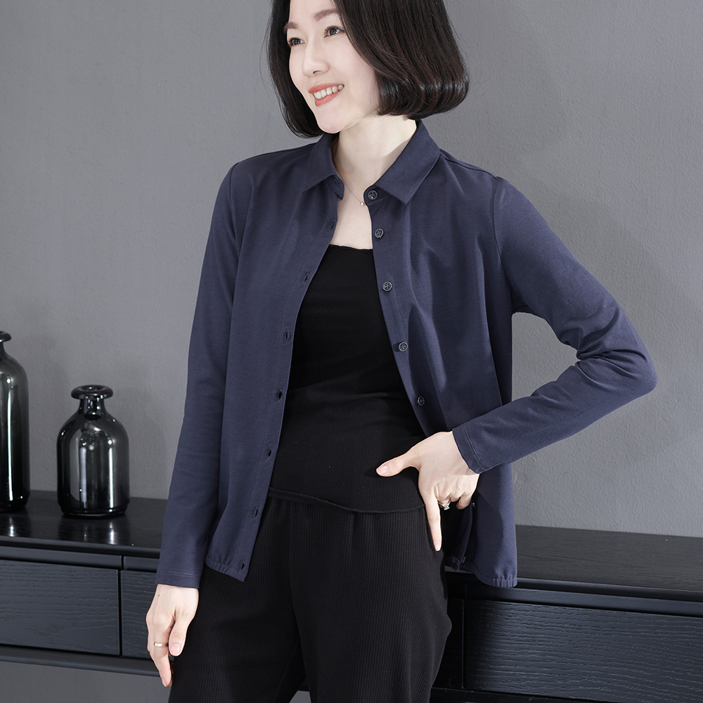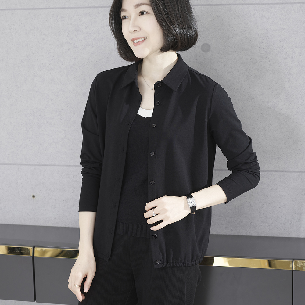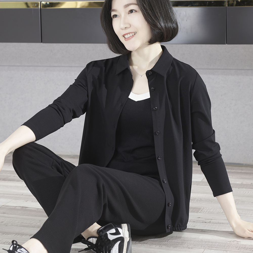 黑色莫代尔棉女士长袖t恤polo领翻领衬衫领宽松洋气妈妈上衣开衫