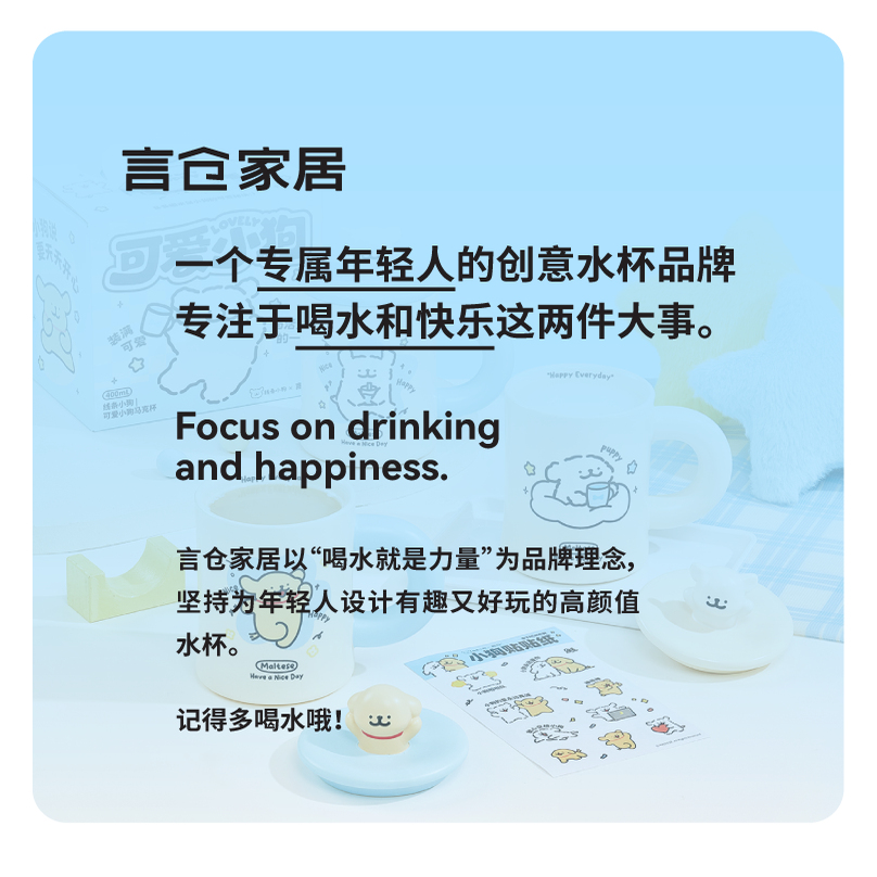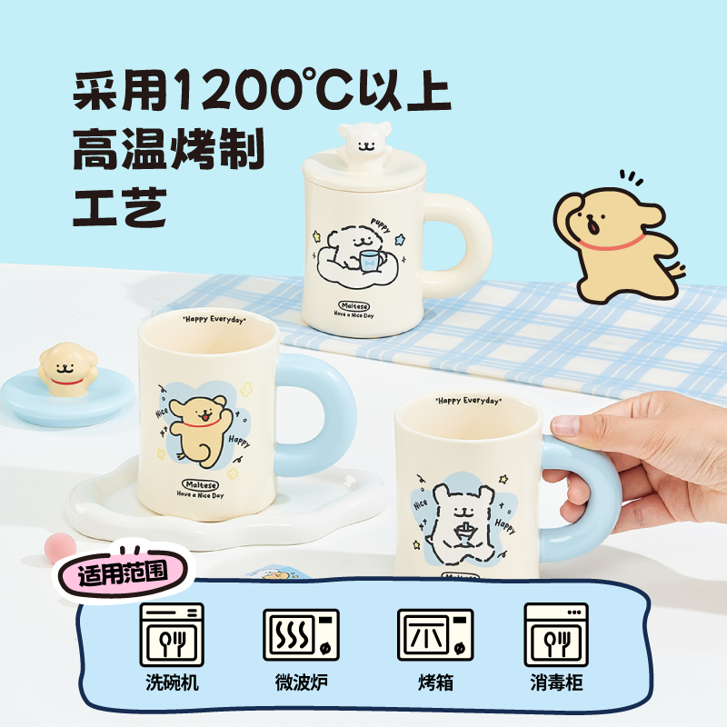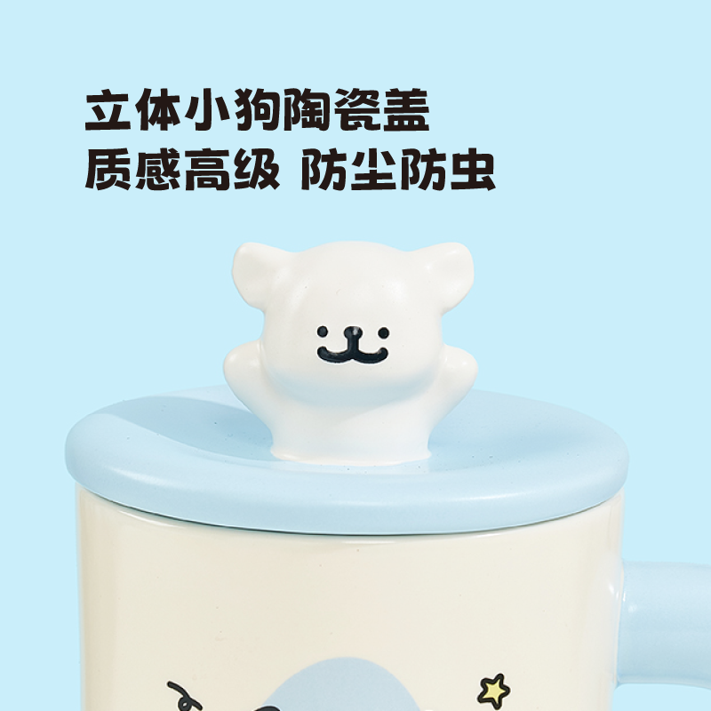 言仓线条小狗马克杯陶瓷立体杯盖大把手带盖居家咖啡杯陶瓷水杯