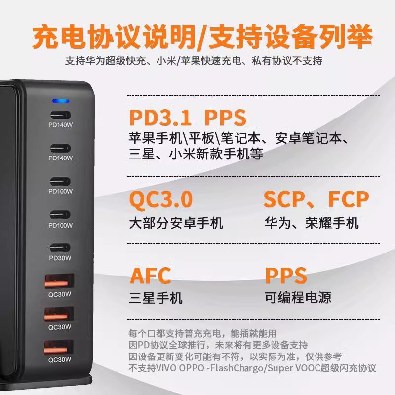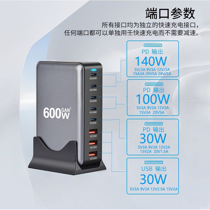 氮化镓桌面充电站多口usb充电器TypeC插座多孔插头PD快充600W闪充