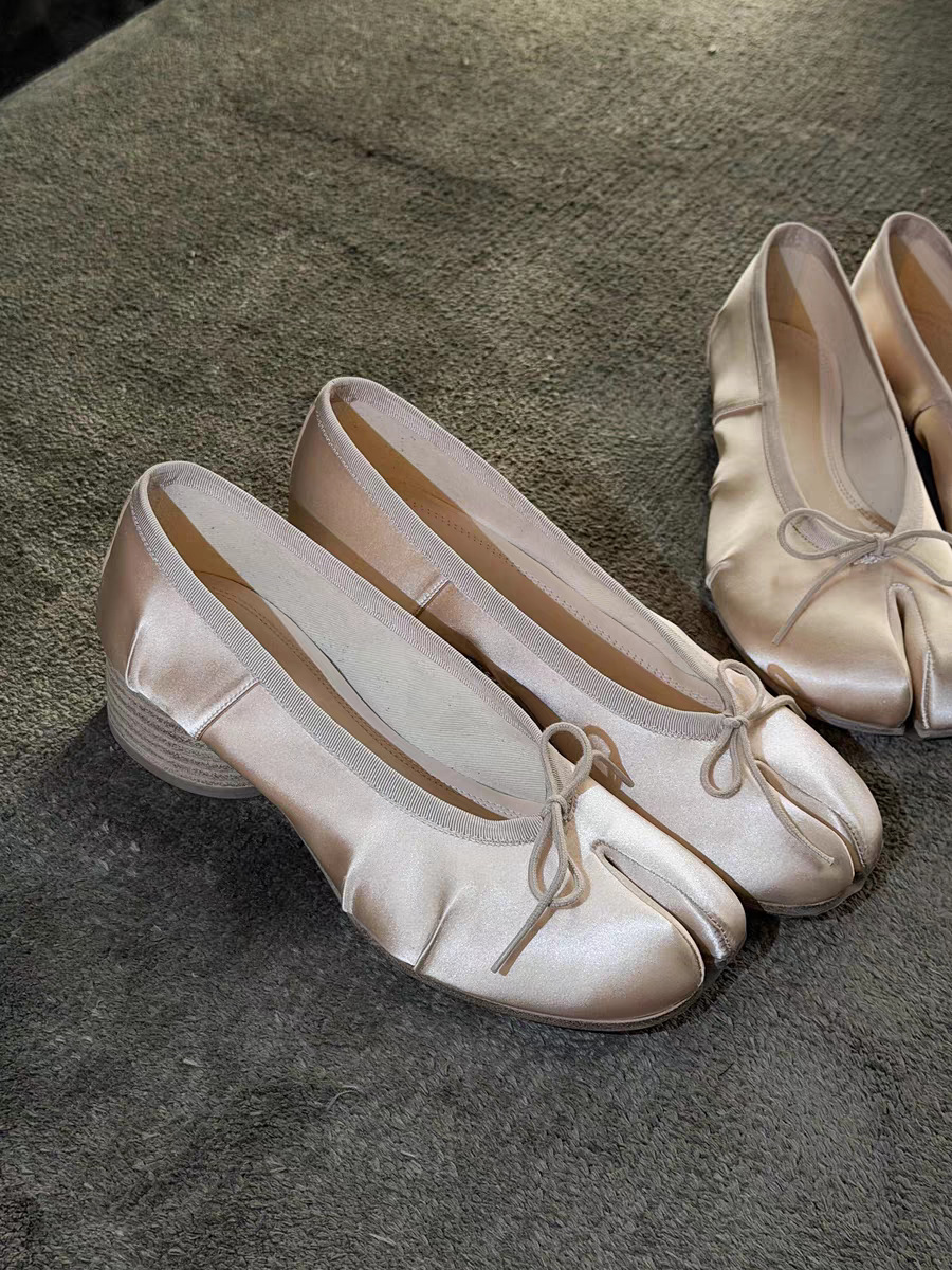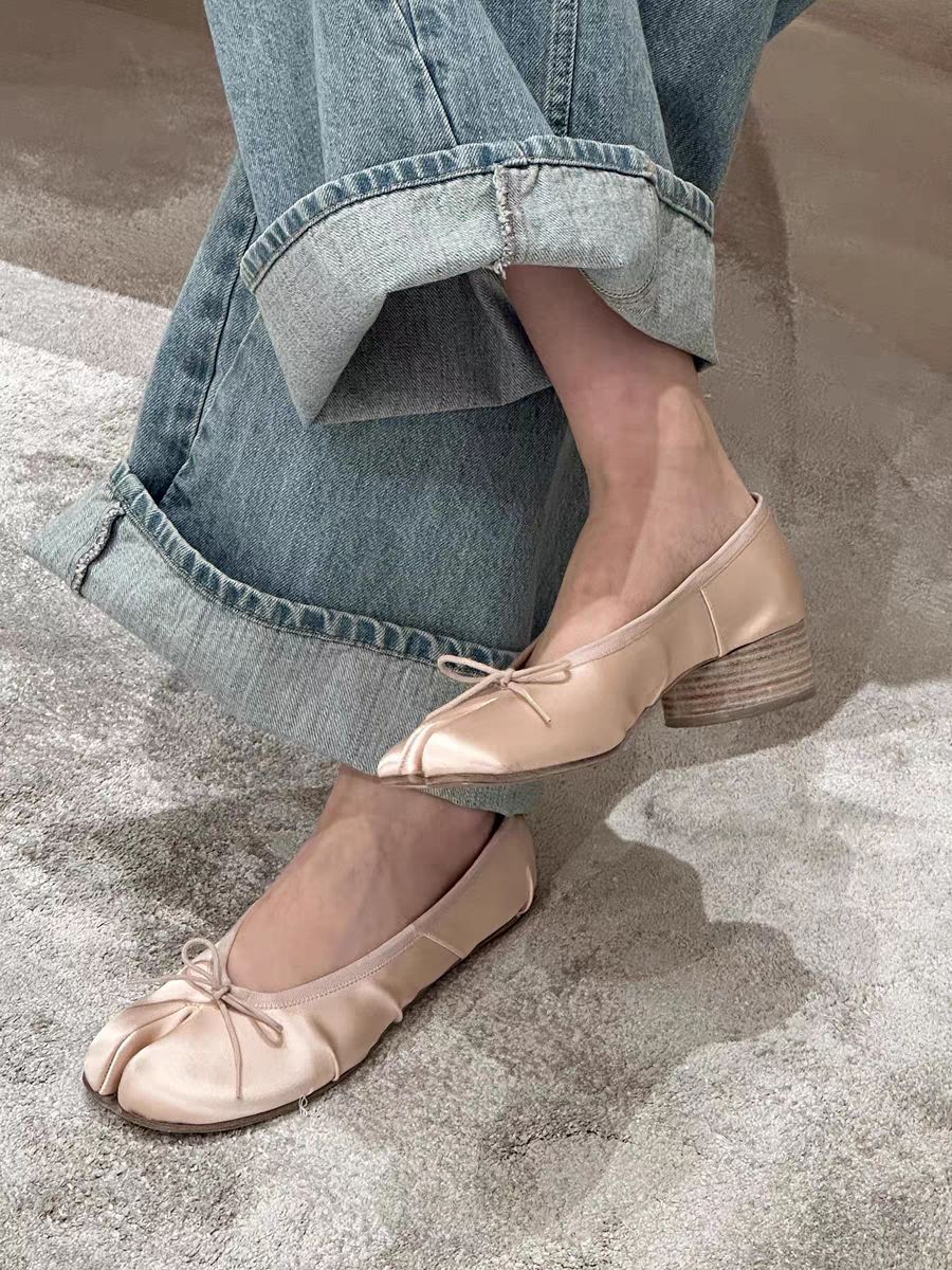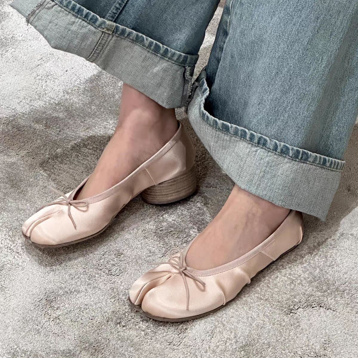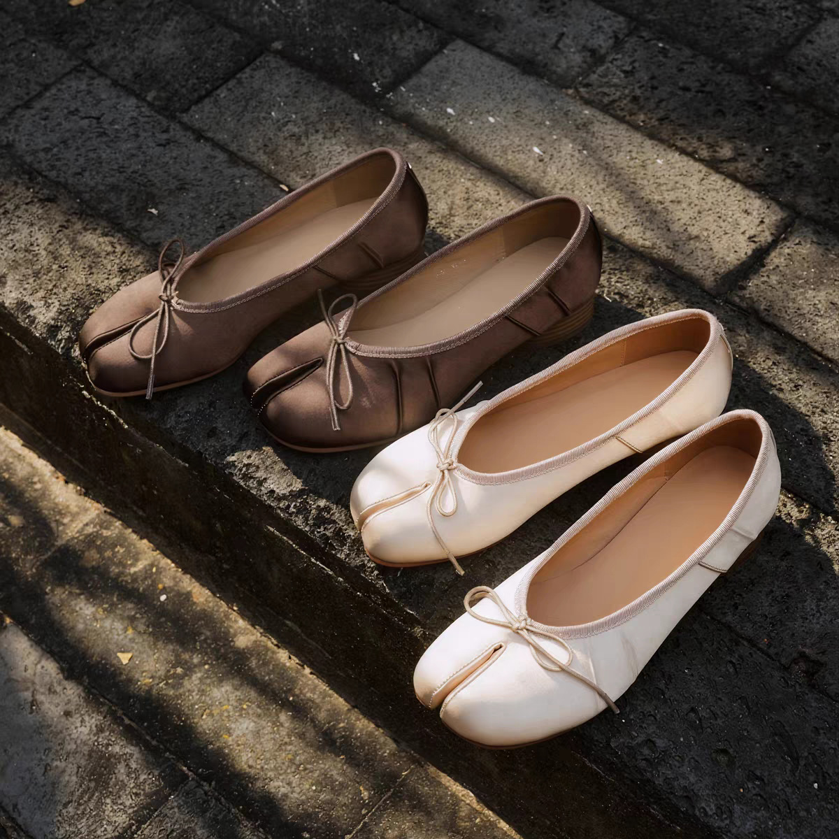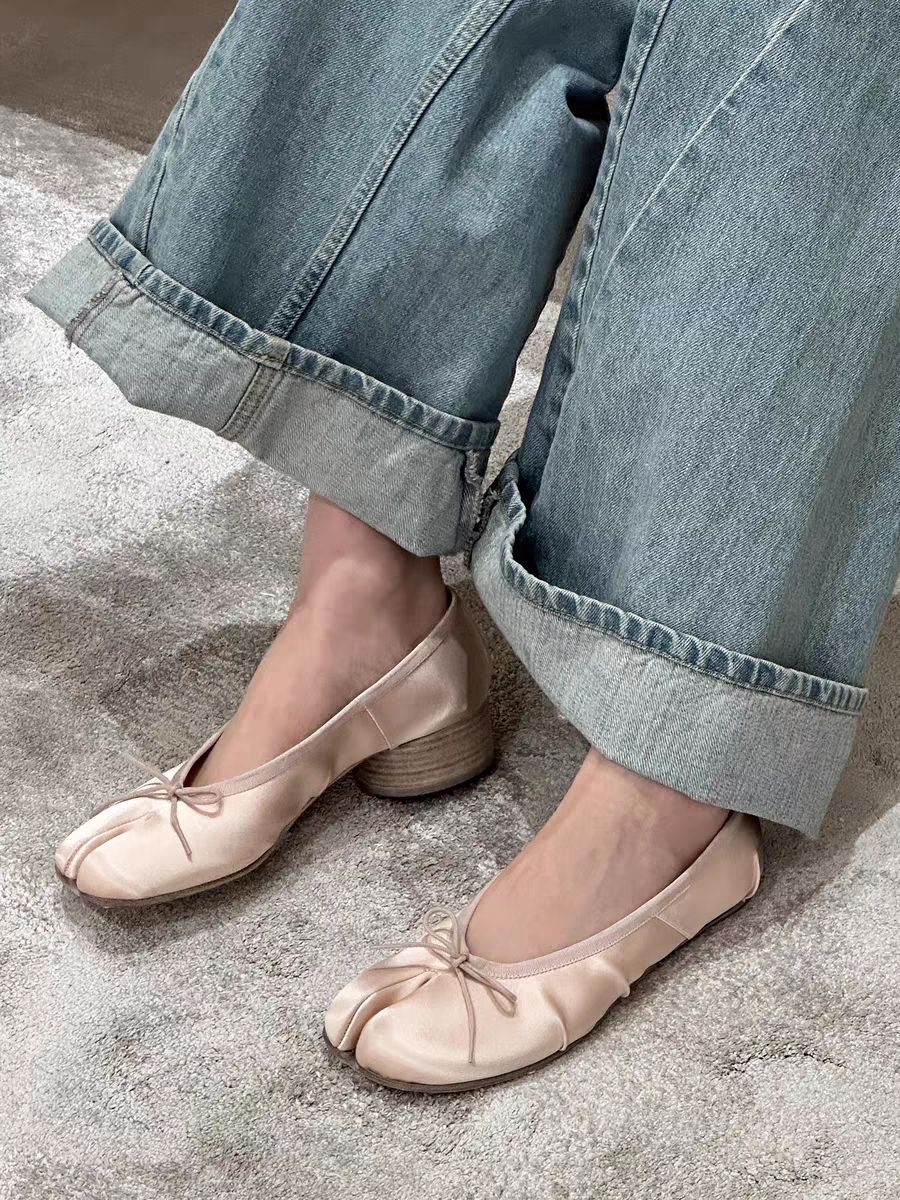 1688现货版~2026春季新款绸缎圆头分趾猪蹄平底玛丽珍单鞋女褶皱芭蕾