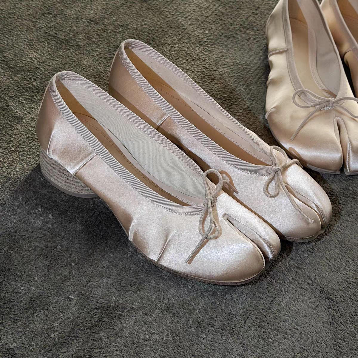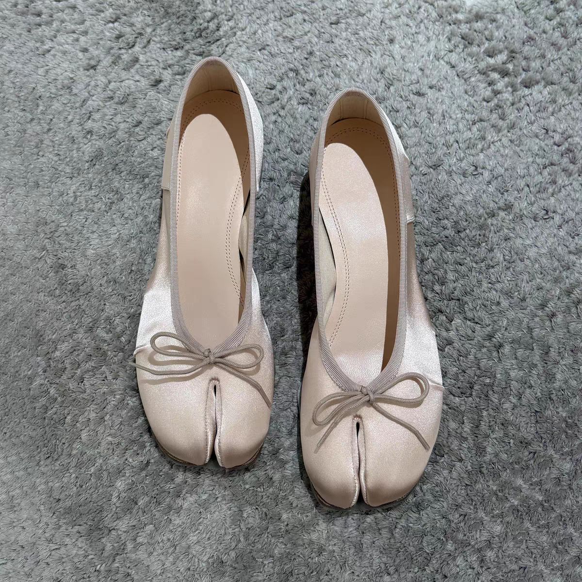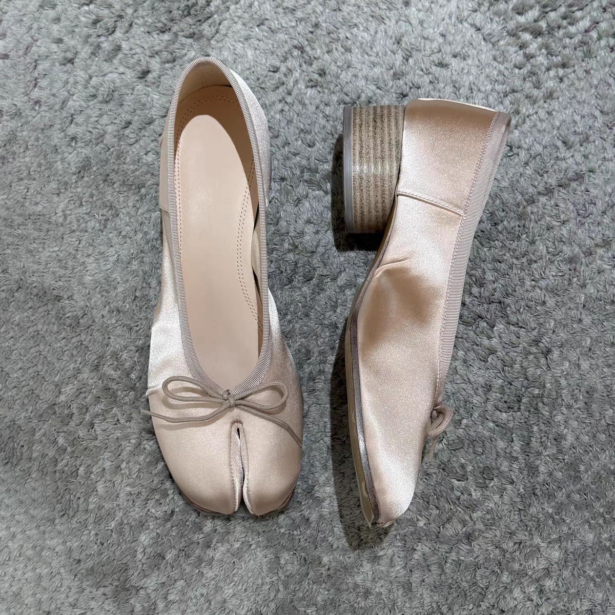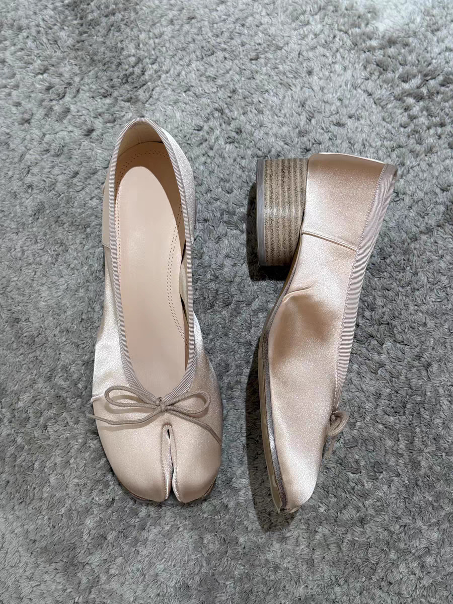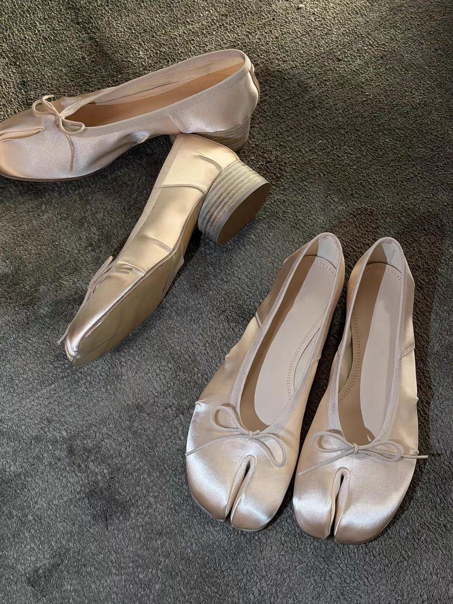1688现货版~2026春季新款绸缎圆头分趾猪蹄平底玛丽珍单鞋女褶皱芭蕾
