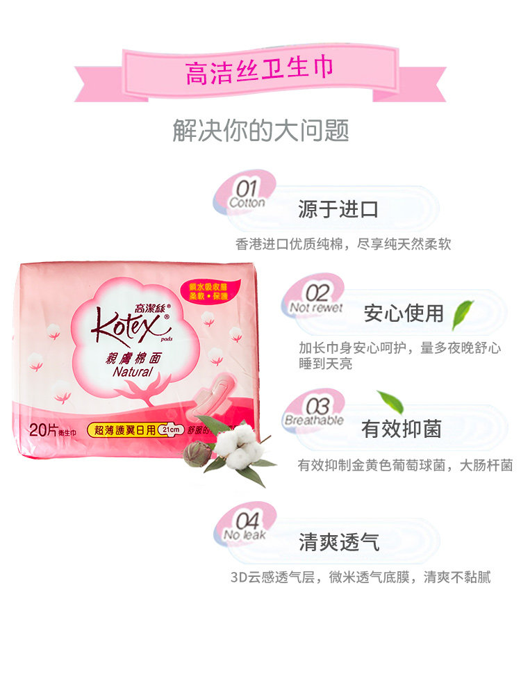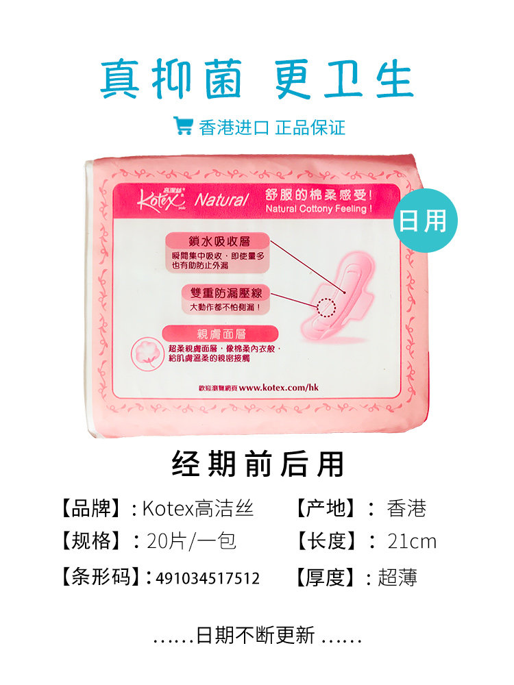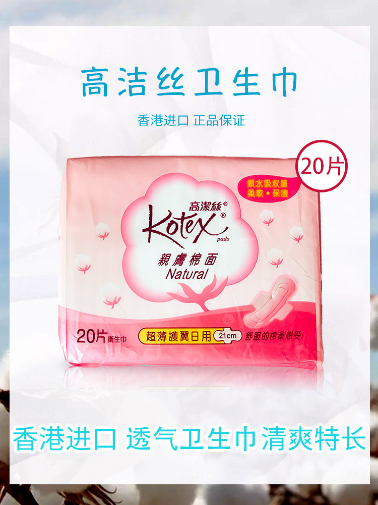 淘宝香港Kotex/高洁丝卫生巾亲肤棉面超薄护翼日用干爽抑菌21CM 20片