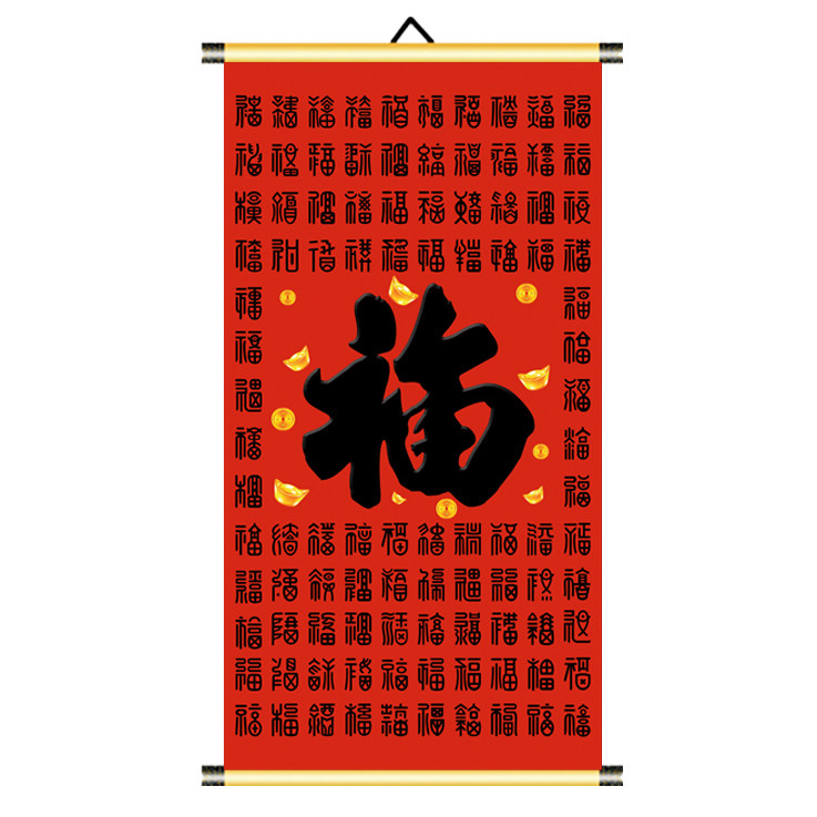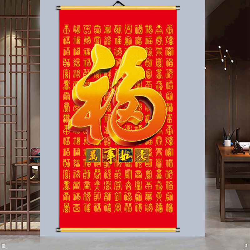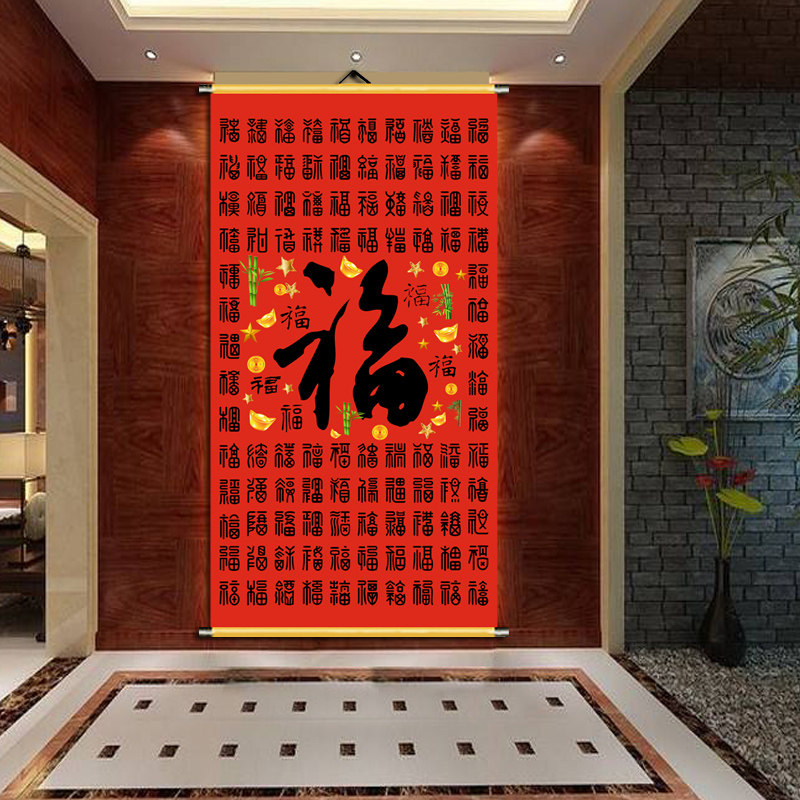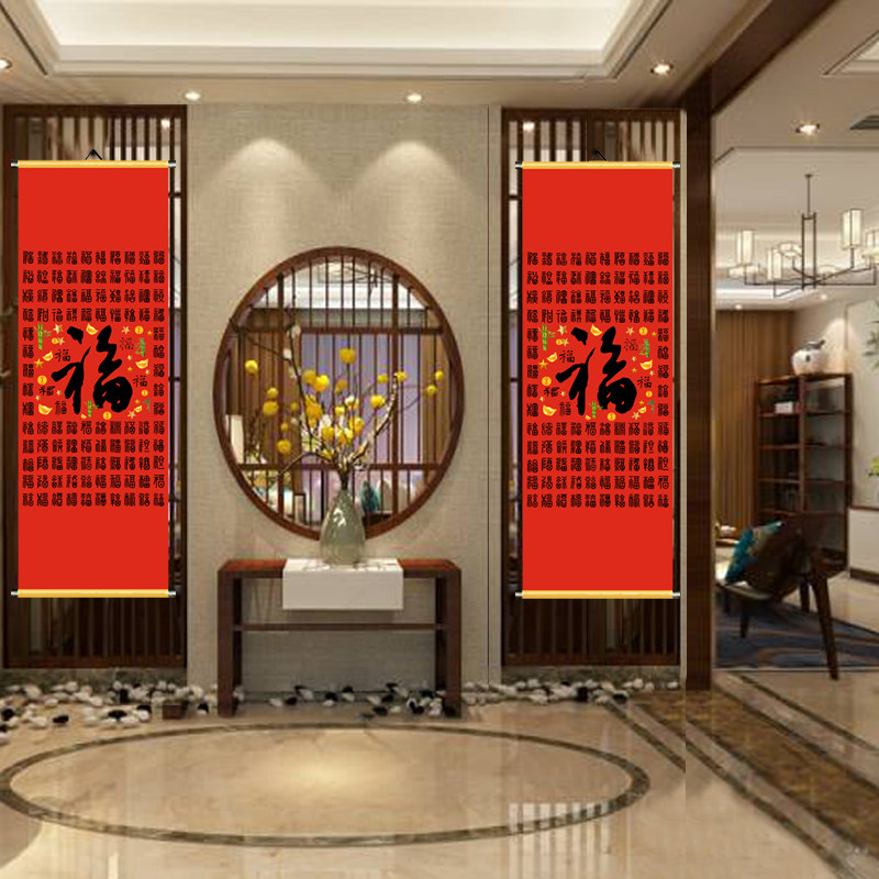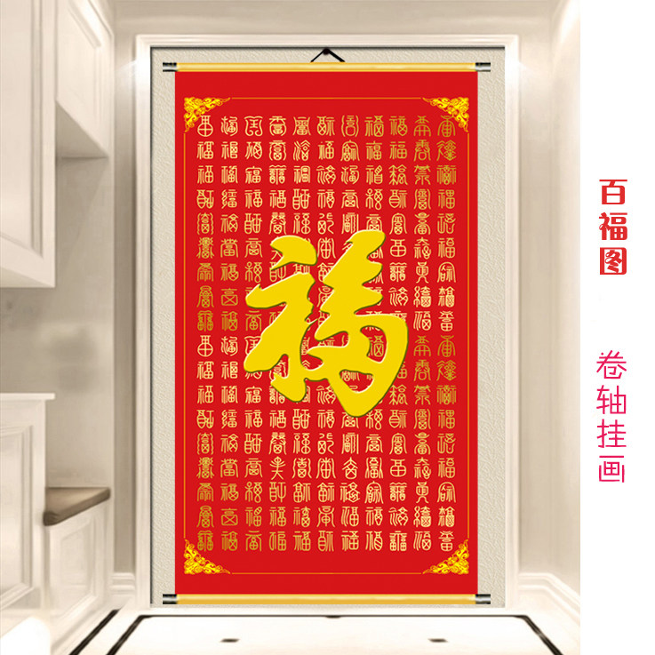 淘宝百福图卷轴挂画玄关过道风水福字装饰画新中式布画防水喷绘可定制
