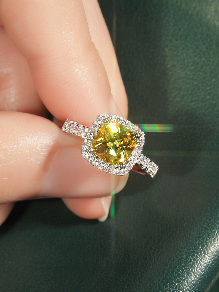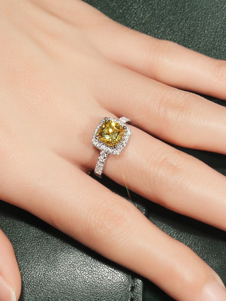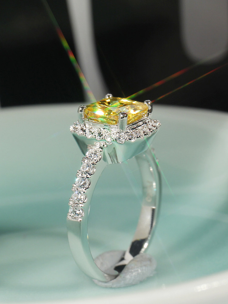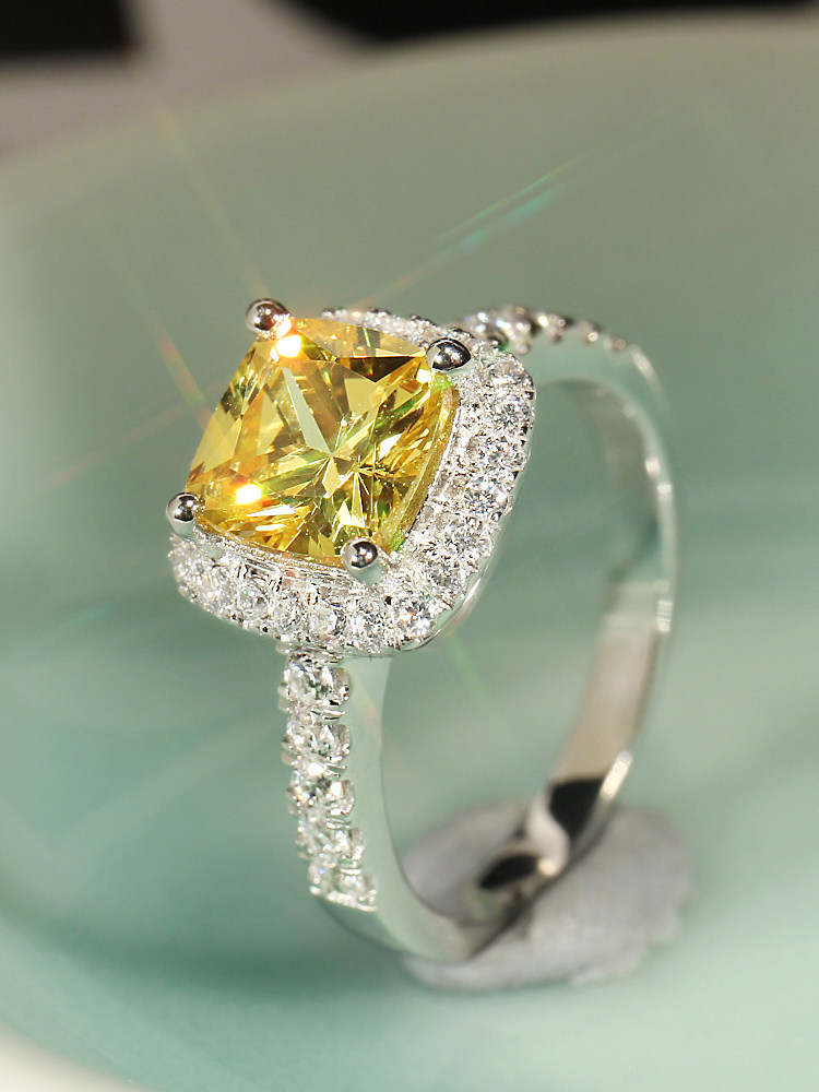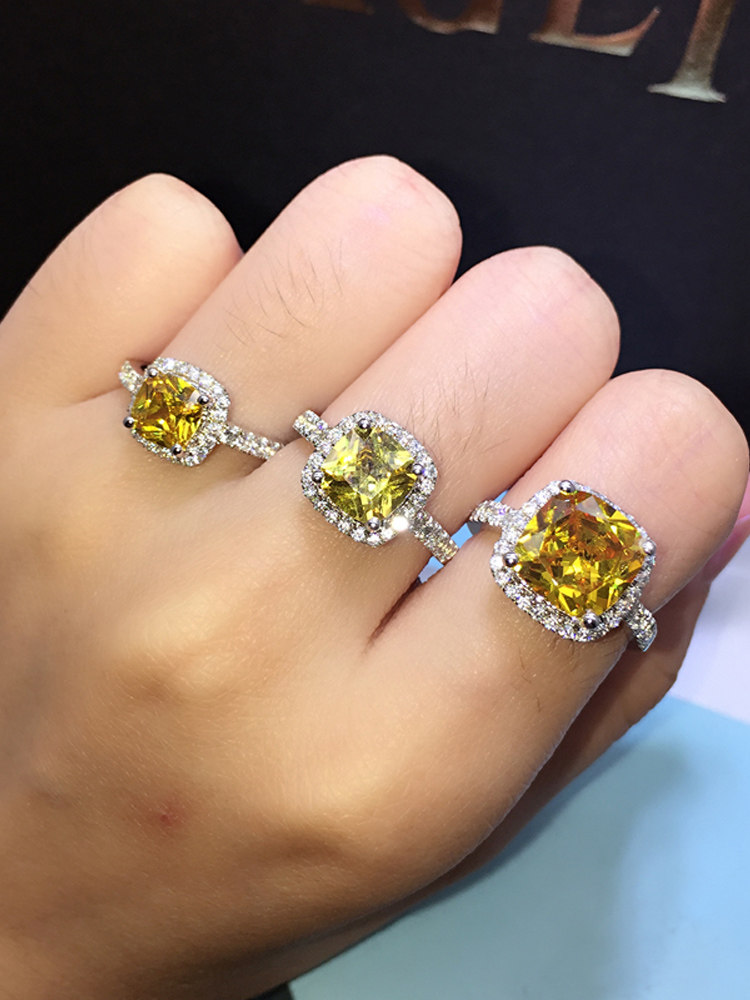 淘宝公主肥方形黄钻戒指女 彩色宝石纯银镀PT950莫桑求婚对戒仿真钻戒