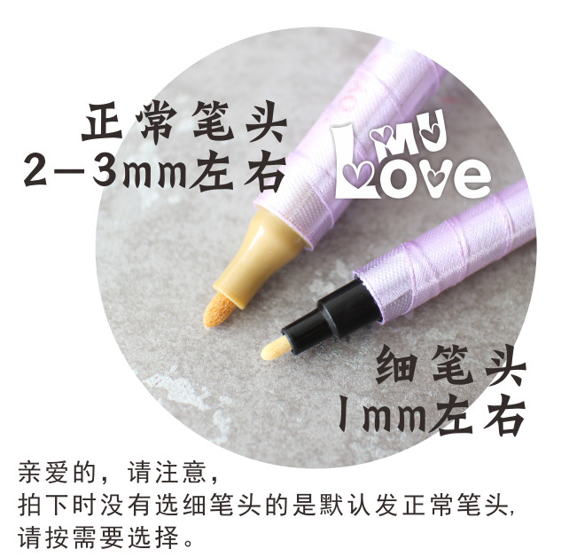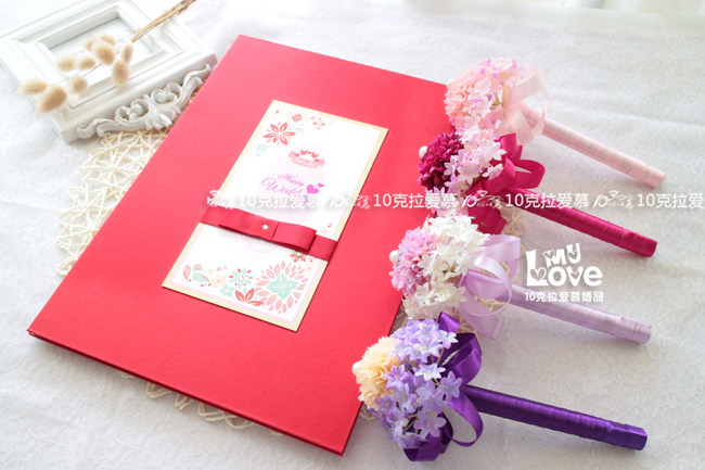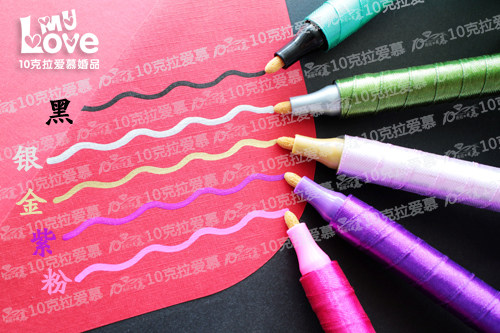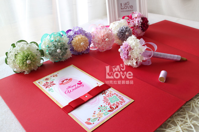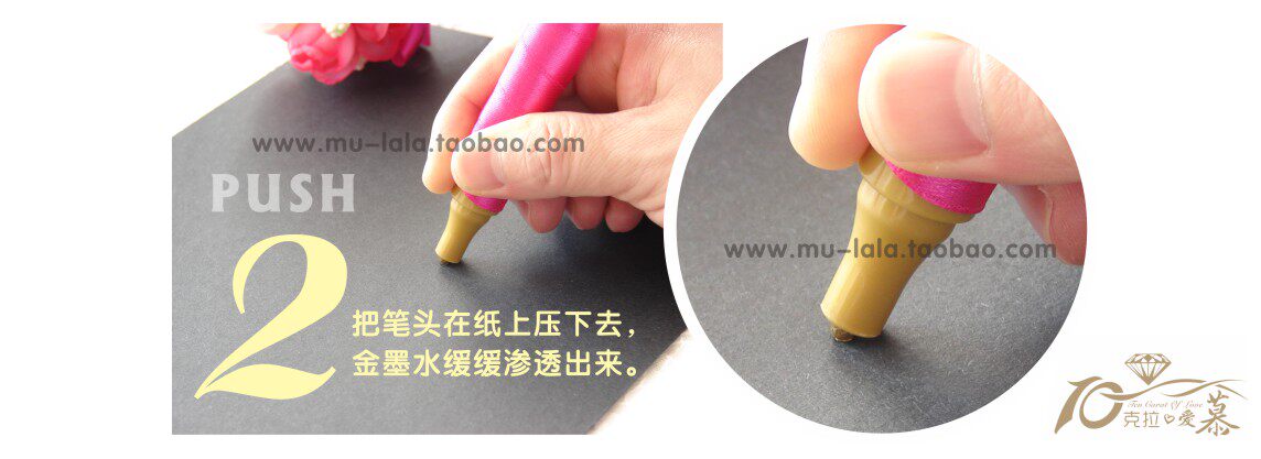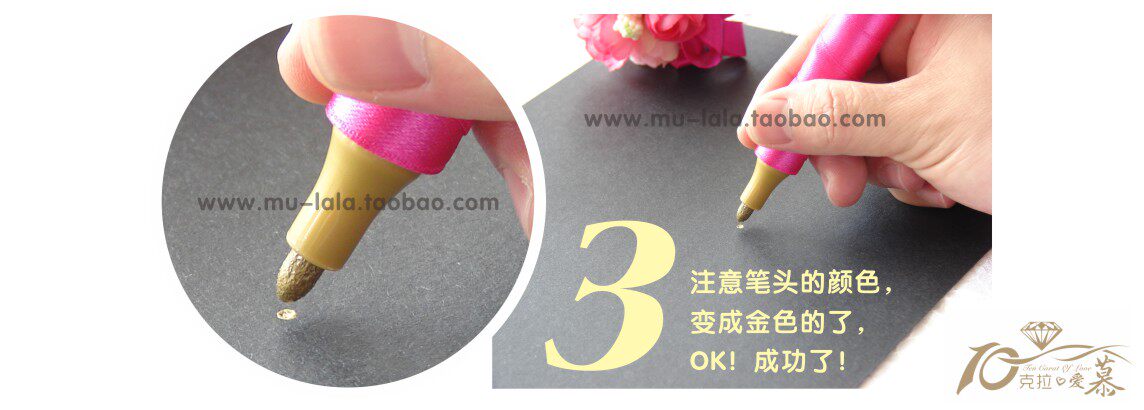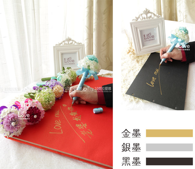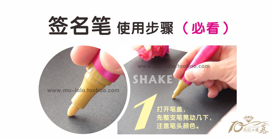 请注意,花球签到笔刚打开的时候笔头是干的,第一次使用前要用力摇动,再把笔尖压下去,等金墨水出来了,就可以书写了,(先好在别的纸上试验墨水,以防弄到本上)写到没水了,再压下去重复,就可以了,不明白欢迎随时来咨询哈!婚礼前一天再开封啊,免得挥发掉墨水,哈!用完的时候请记得盖上笔盖!