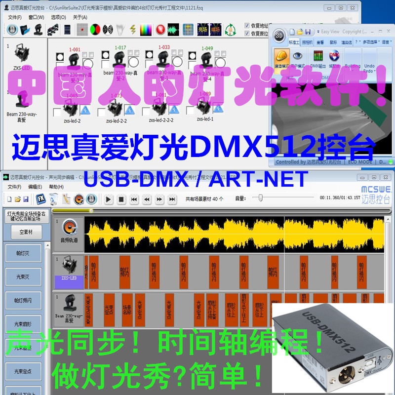 淘宝迈思真爱灯光控制软件USB-DMX512电脑控台控制器舞台带3D模场景