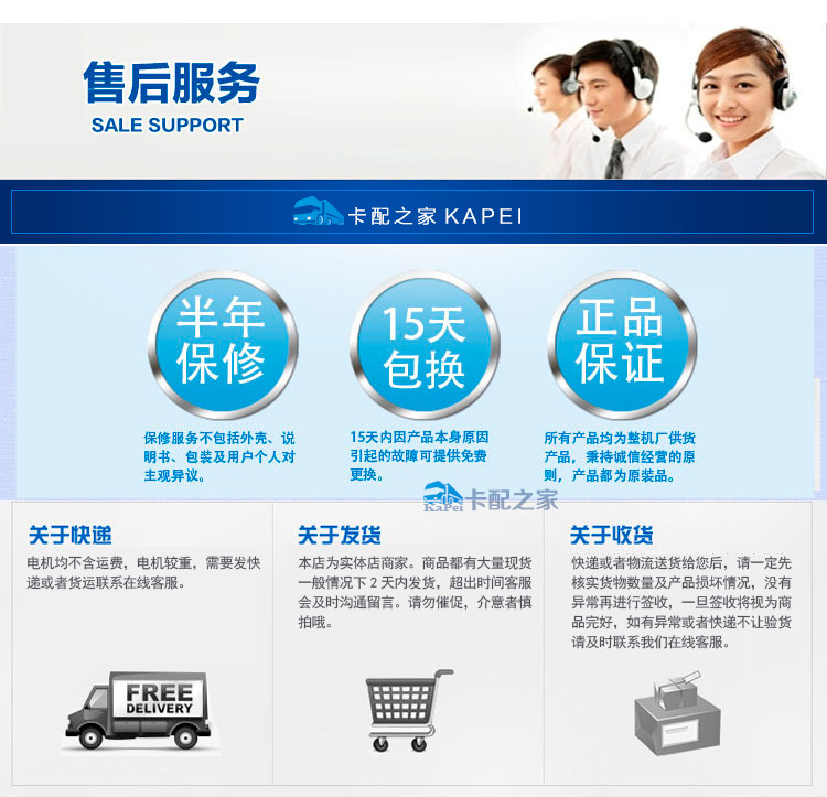 4.关于运输:本店默认中通快递,需要其他快递请联系在线客服(小配件建议大家使用一般快递,三天左右到达,重的、体积大的配件费用较高本店会尽量联系价位较低的快递或物流公司,中铁快件需要大家提供收货人的真实姓名和身份证号提货时使用。边远地区只能通过EMS费用较高请客户谅解。)