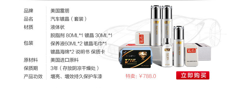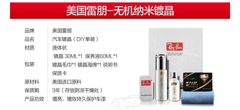 淘宝美国雷朋车漆镀晶液汽车镀金剂无机纳米美容养护镀膜封釉包施工