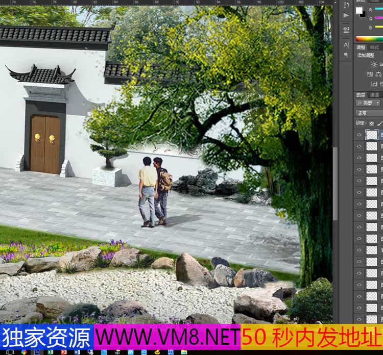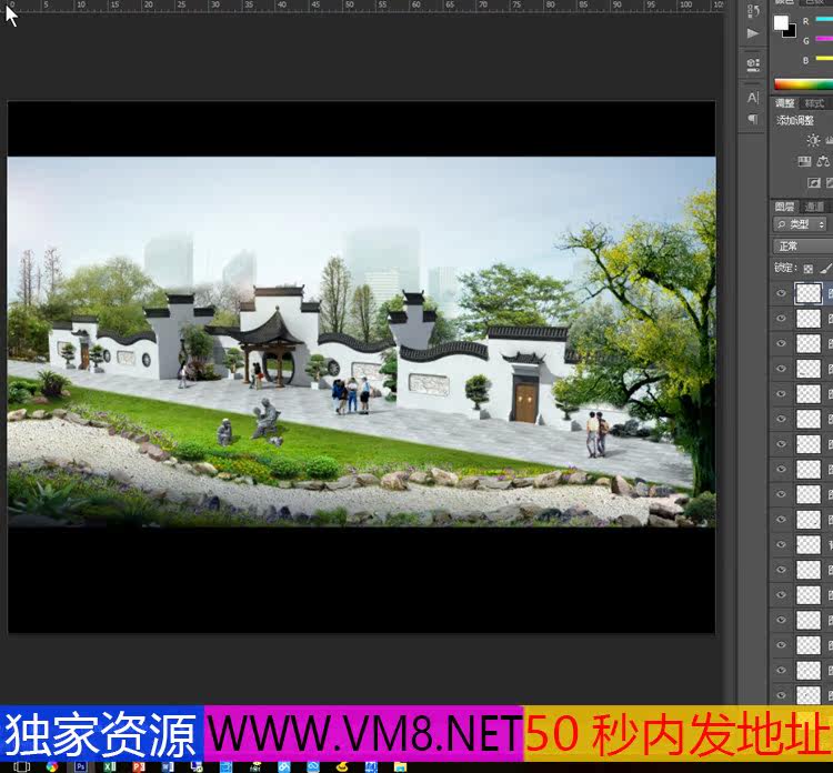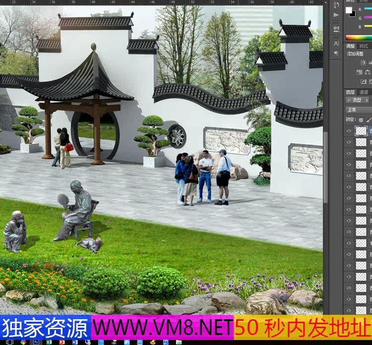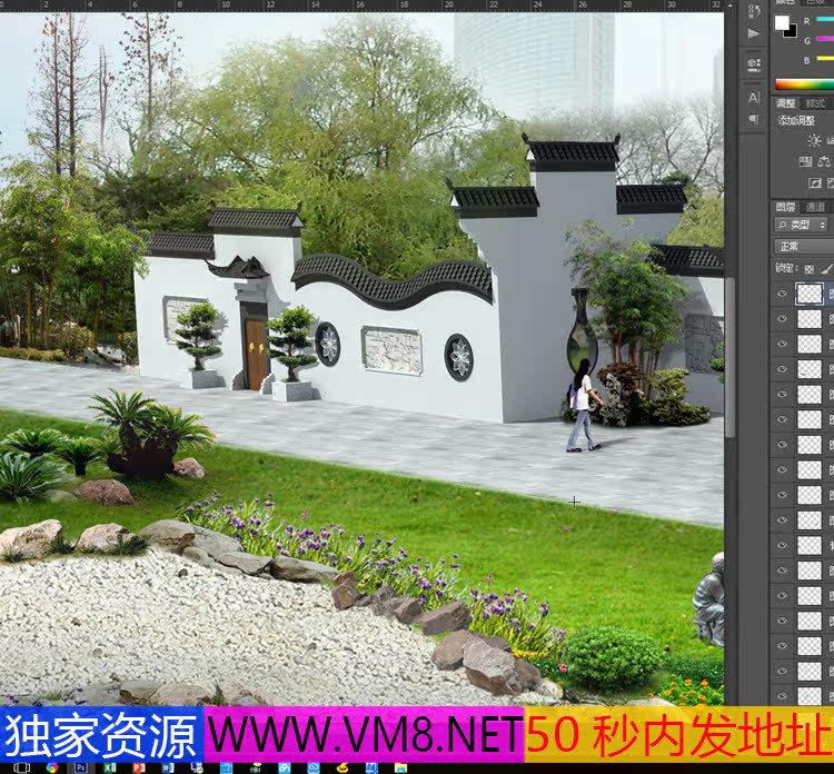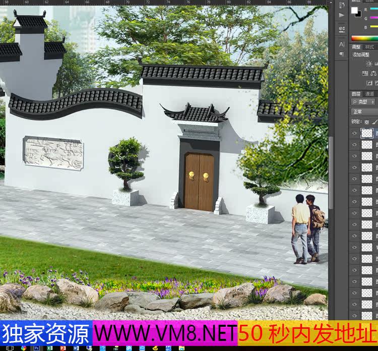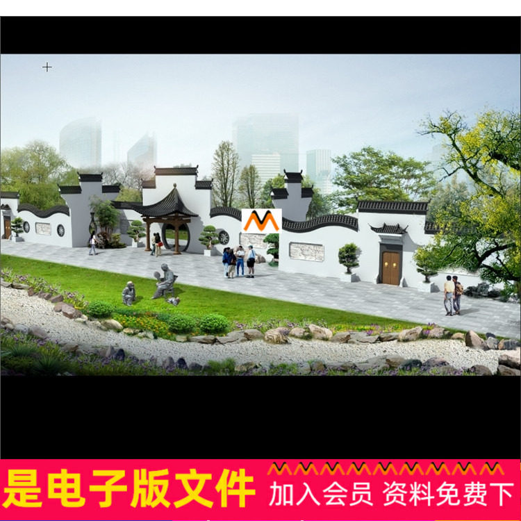 淘宝L1278中式古典公园林沿街绿化带围墙高院景观设计效果图PSD源文件
