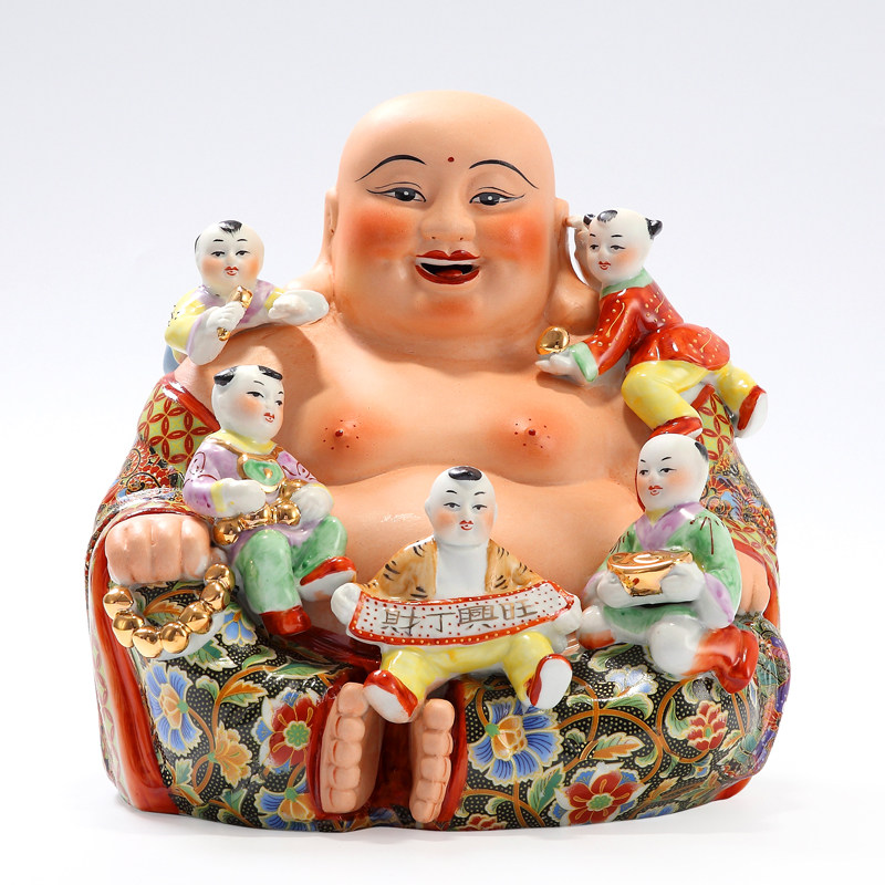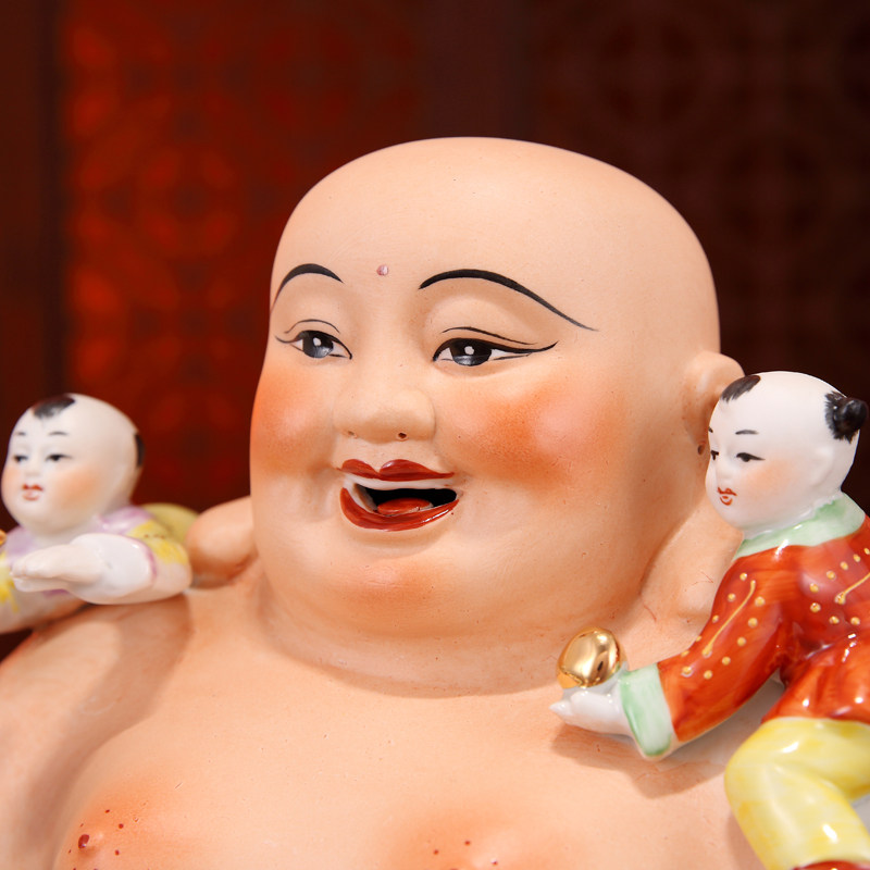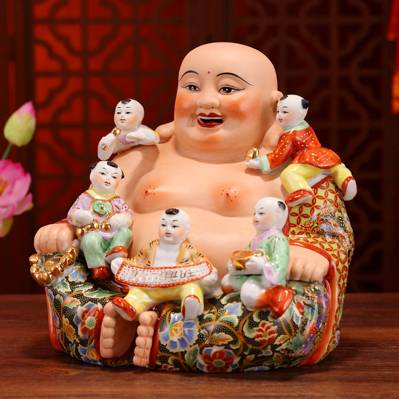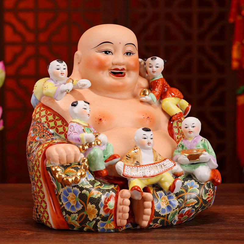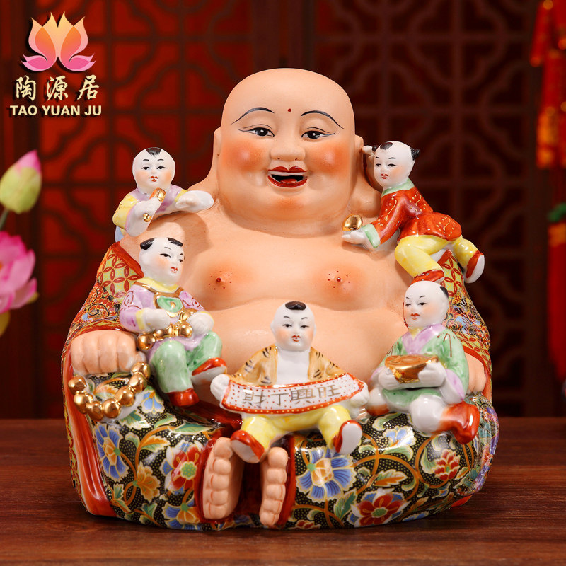 淘宝陶瓷五子弥勒佛神像手工彩绘万子千孙笑佛像家居客厅镇宅供奉摆件