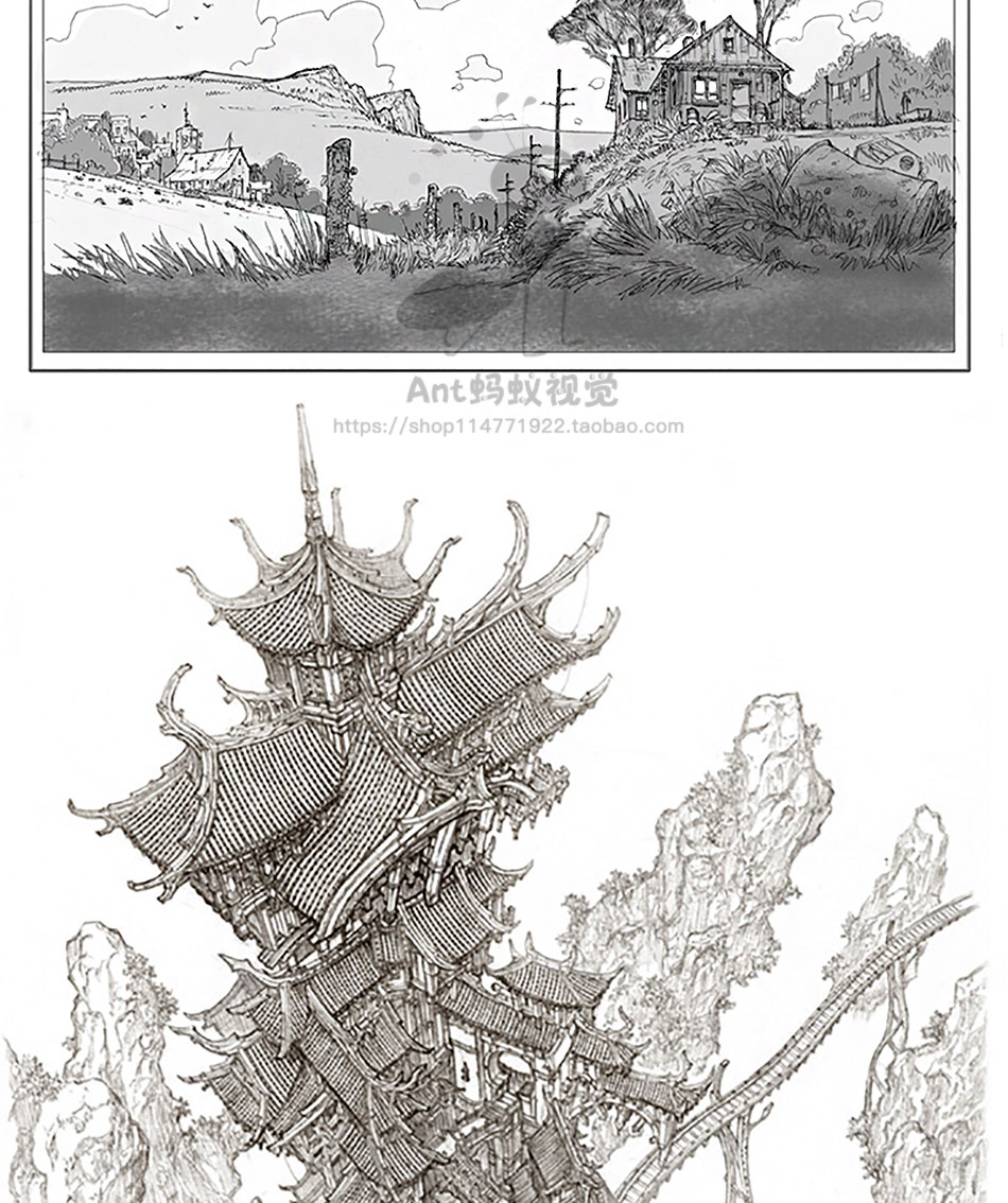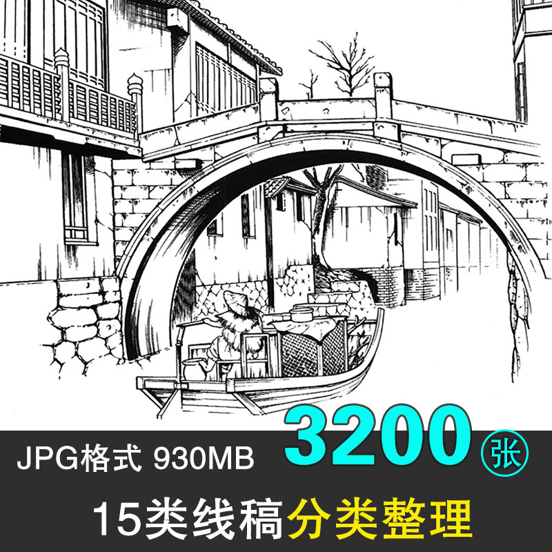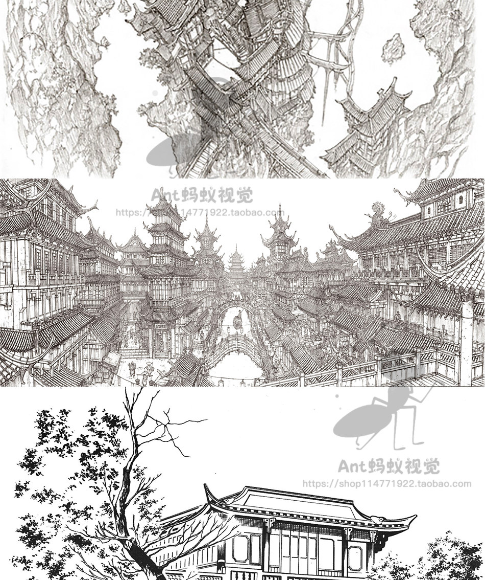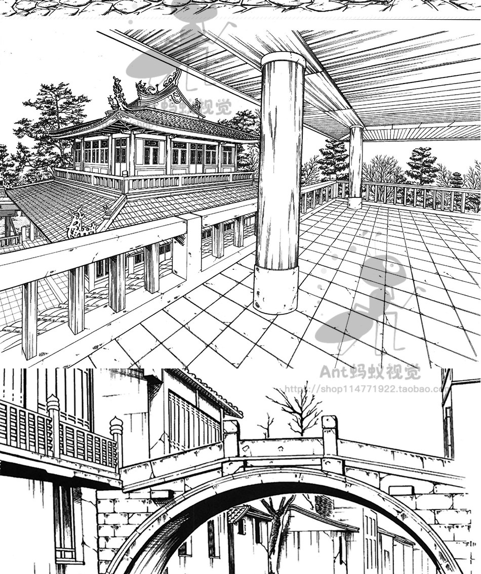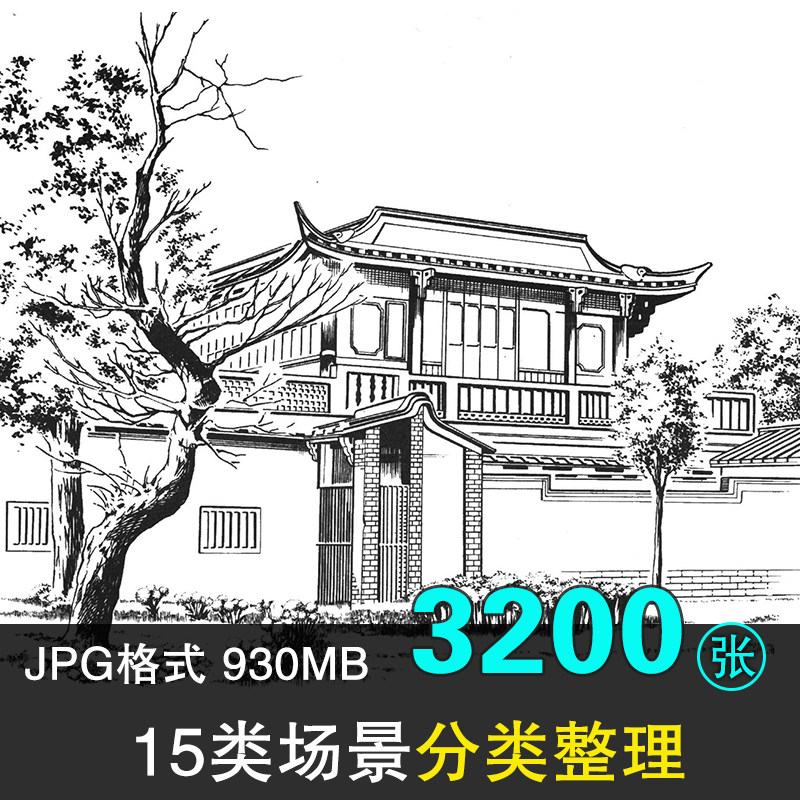 淘宝自然风光园林植物现代古代建筑手绘黑白线稿素材漫画背景速写画技