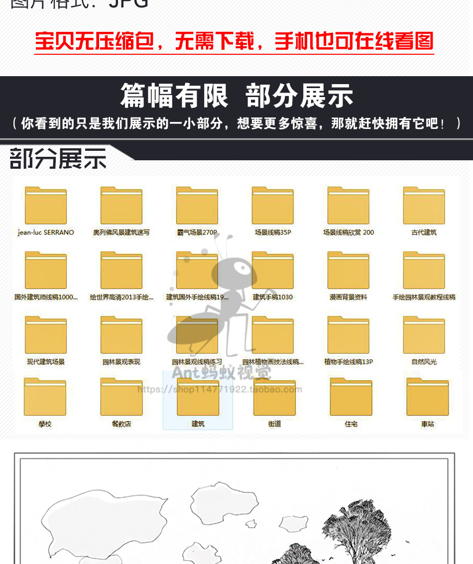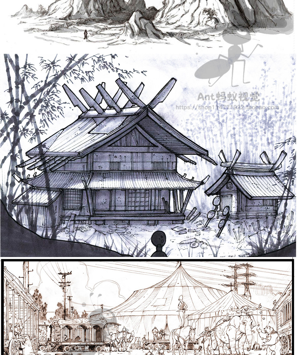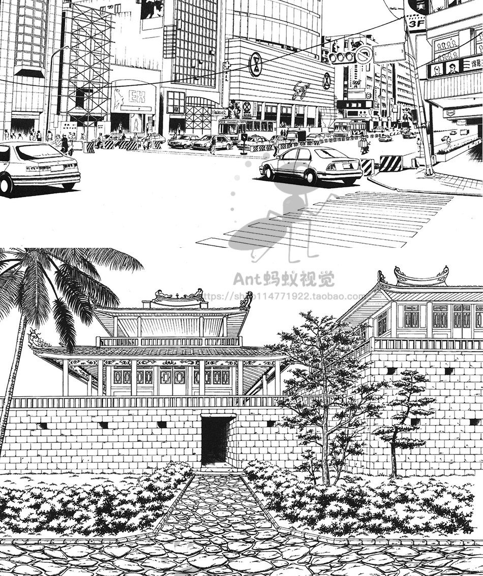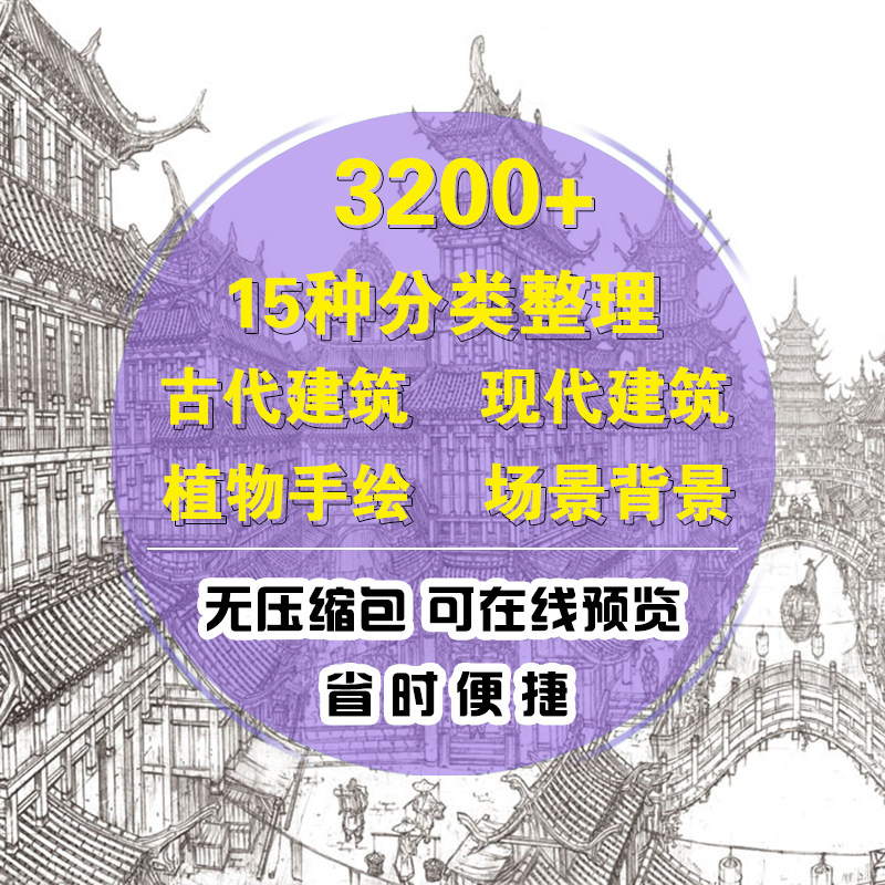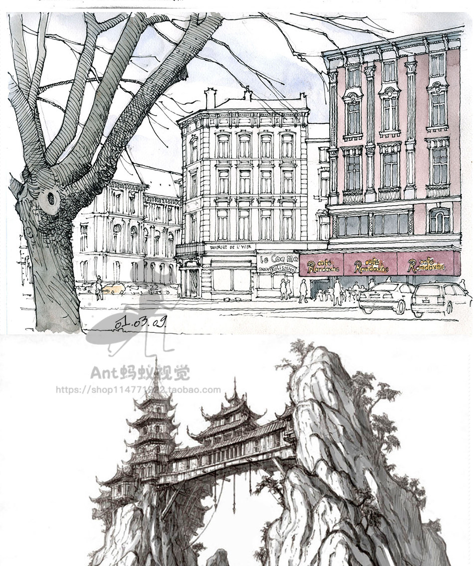 淘宝自然风光园林植物现代古代建筑手绘黑白线稿素材漫画背景速写画技