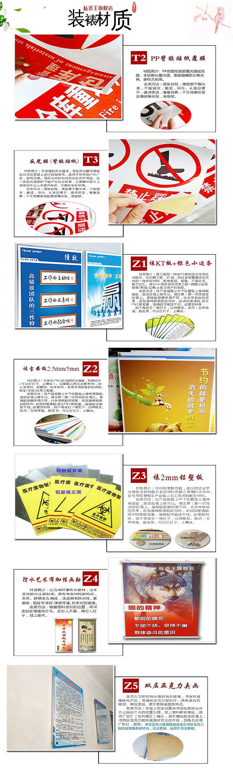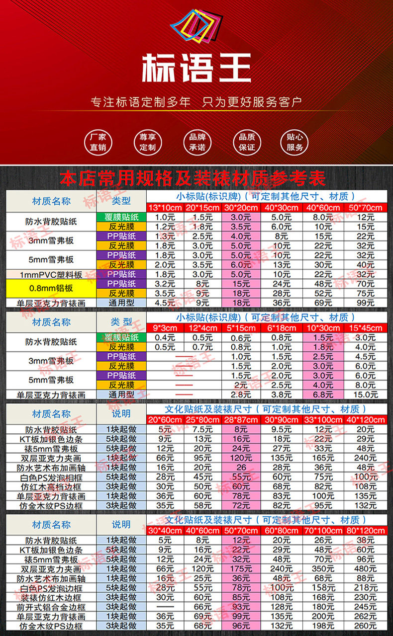 常用材质:防水PP贴纸(纸张克数:150克,是一种合成纸,约0.15毫米厚,后面有一层透明保护薄膜,揭开即可直接贴在洁净的表面)