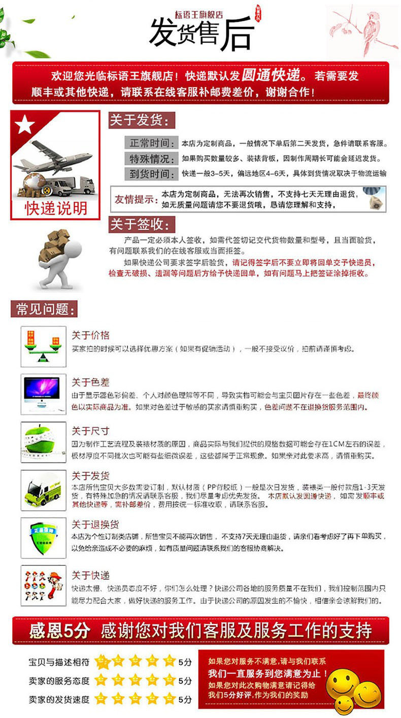 ★★★本店所有商品均为定制类商品,一般情况下单后第二天发货,装裱类可能需要三天左右发货,详情请咨询客服。因不能再次出售,故不支持七天无理由退货,请亲们多多理解和支持哦!