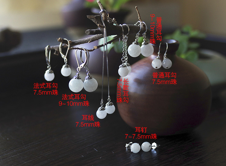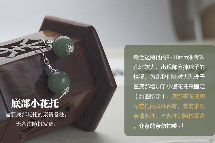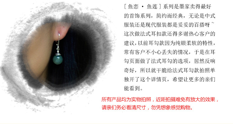 【品名】[鱼莲恋]-天然翡翠银法式耳环 【材质】 天然翡翠(缅甸玉)、s925银 【颜色】 油青色(分为浅色/中色/深色)、冰糯白、浅 豆青、飘花,其中油青色需要备注深浅需求, 无备注要求随机发色 【尺寸 】珠直径7-8mm/9-10mm,