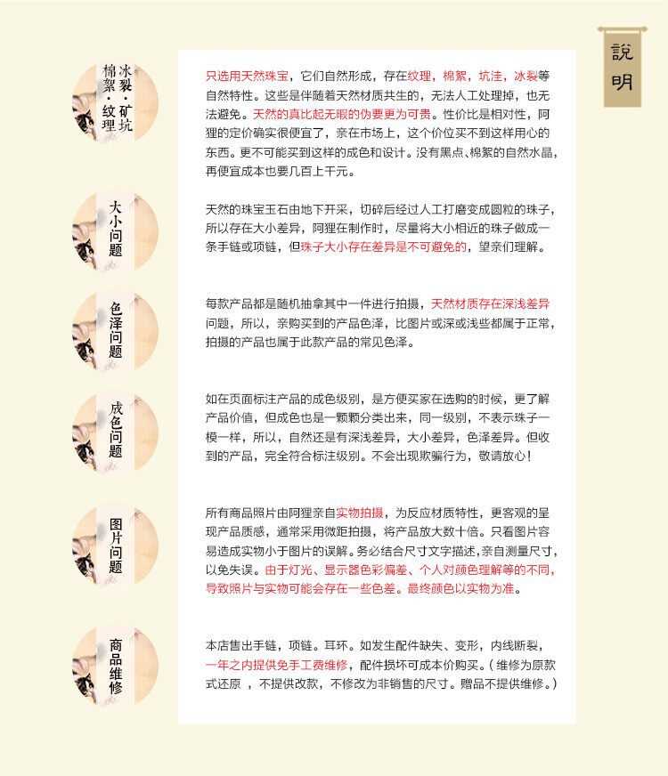 【备注】 ①天然材质存在深浅不一、纹理各异、棉絮、大小差异(±1mm)等情况,介意慎拍; ②图片为微距拍摄,请参看上述尺寸说明与模特图,勿凭想像购买。 ③由于拍摄光线环境、拍摄设备和显示器差异,每个人看到的宝贝难免会存在少许色差,介意慎拍!! ④图片颜色仅供参考,天然珠子每颗色泽纹理都是世间无二的,我们尽量挑选颜色相近的,实际颜色以亲收到实物为准。