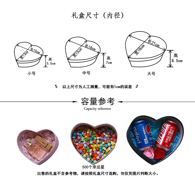 15*13*5.5cm小号可装口红、香水 18*16*7cm中号可装520个幸运星 21*18*8.5cm大号可装2罐可乐 请选择