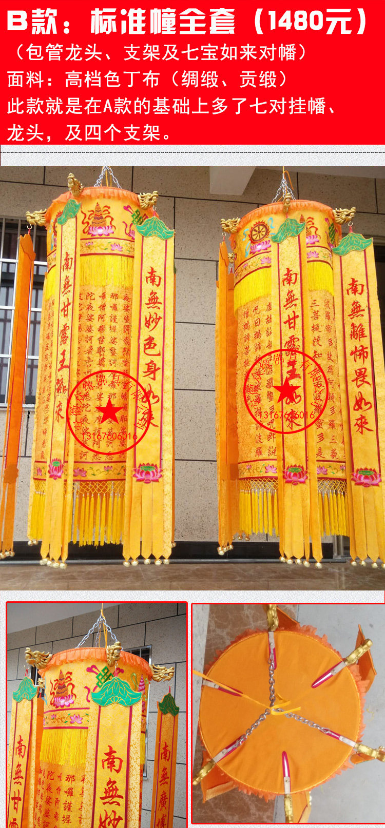注:此款标价为一米的全套价格,即描述中C款全套,包管经幢一对,龙头,支架,七宝如来对幡.