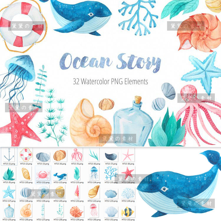 淘宝PS水彩手绘可爱卡通海洋风海底世界鲸鱼水母PNG免扣图片设计素材