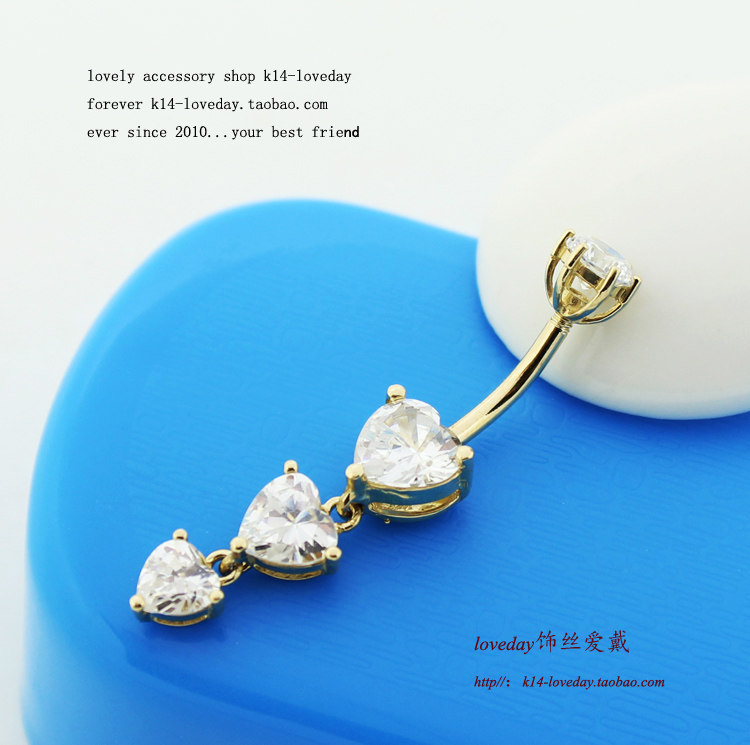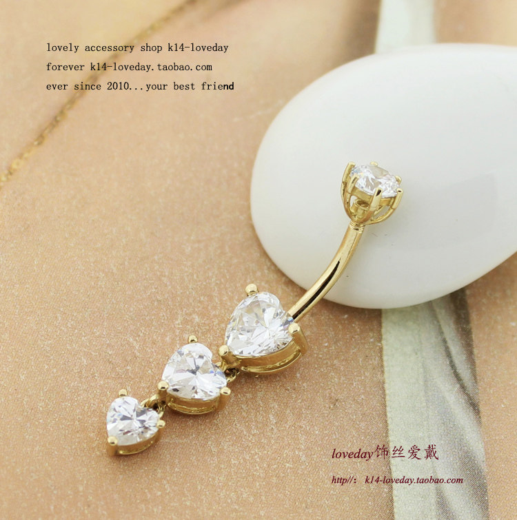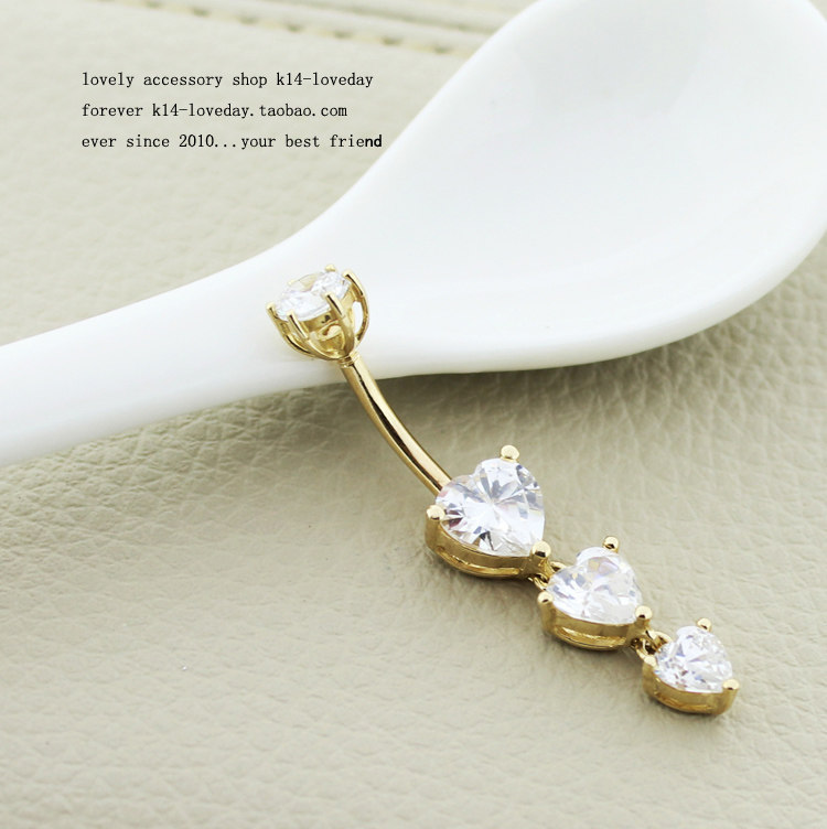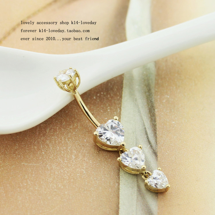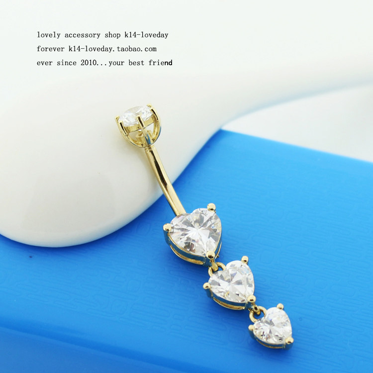 淘宝韩国进口纯14k黄金脐环女 桃心满锆精致k金脐钉长流苏爱心脐钉