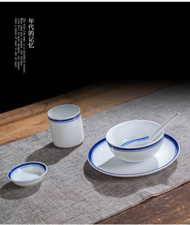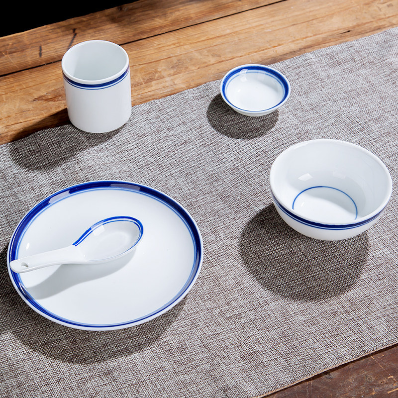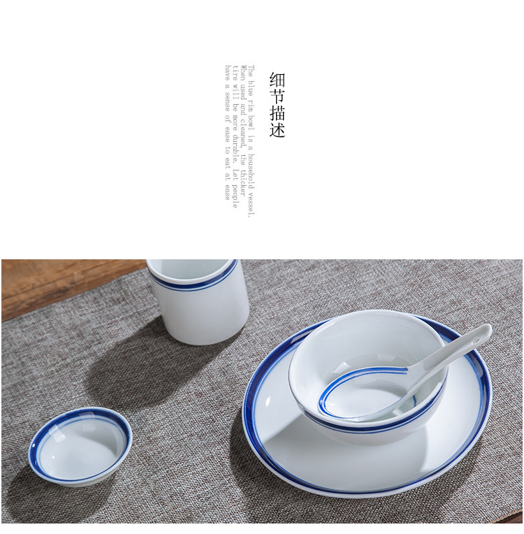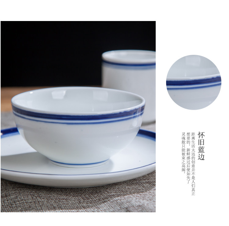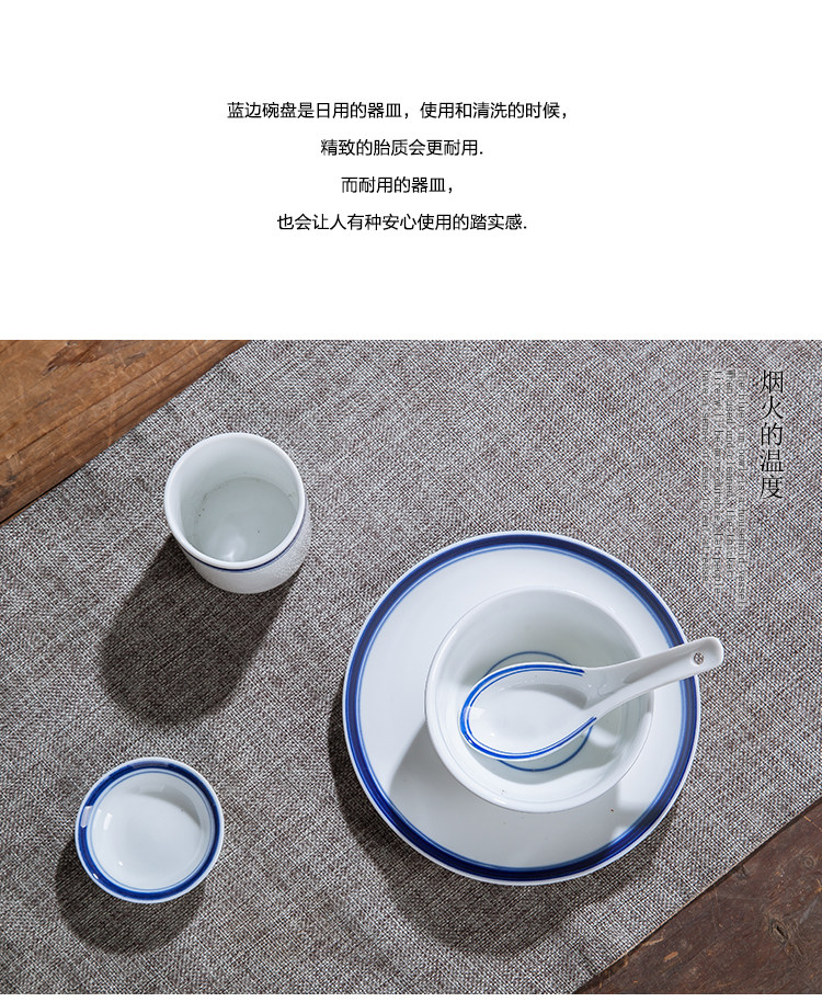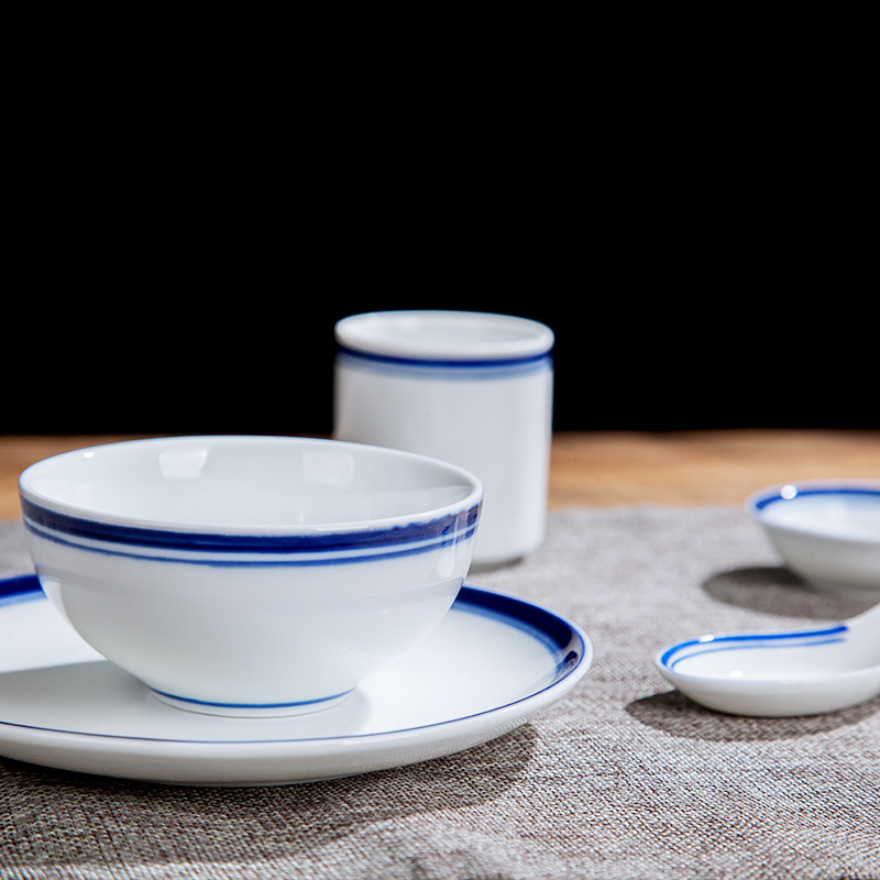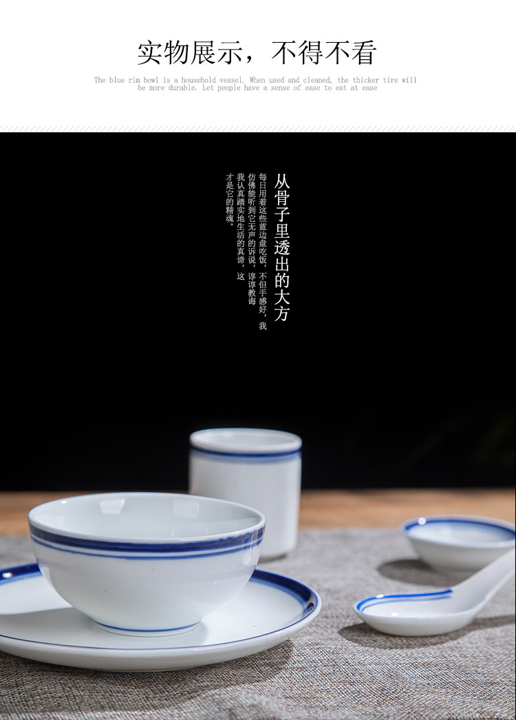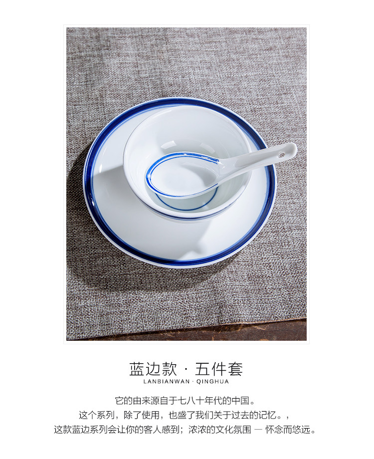 淘宝釉下彩碗碟勺杯味碟甜品店餐具景德镇蓝边碗青花瓷碗盘可定制logo