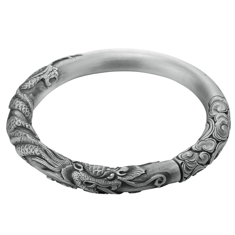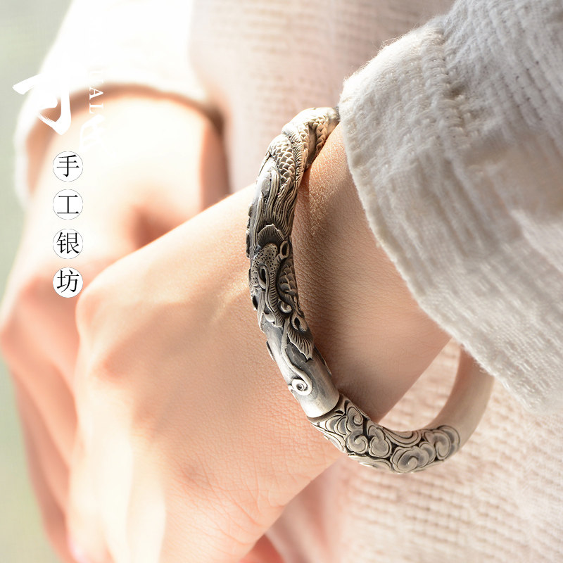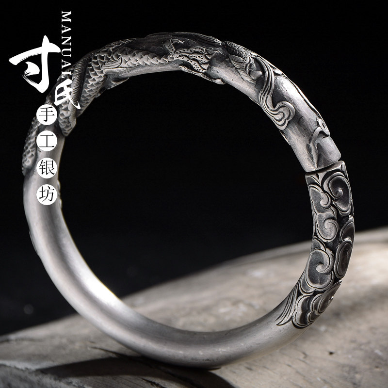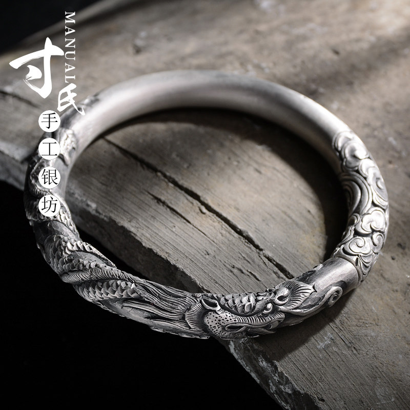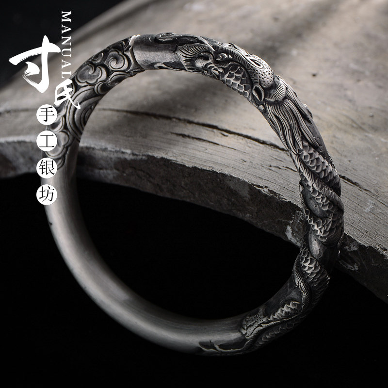 淘宝寸银坊云南手工制作足银复古立体圆柱浮雕实心单龙抱柱手镯.传承